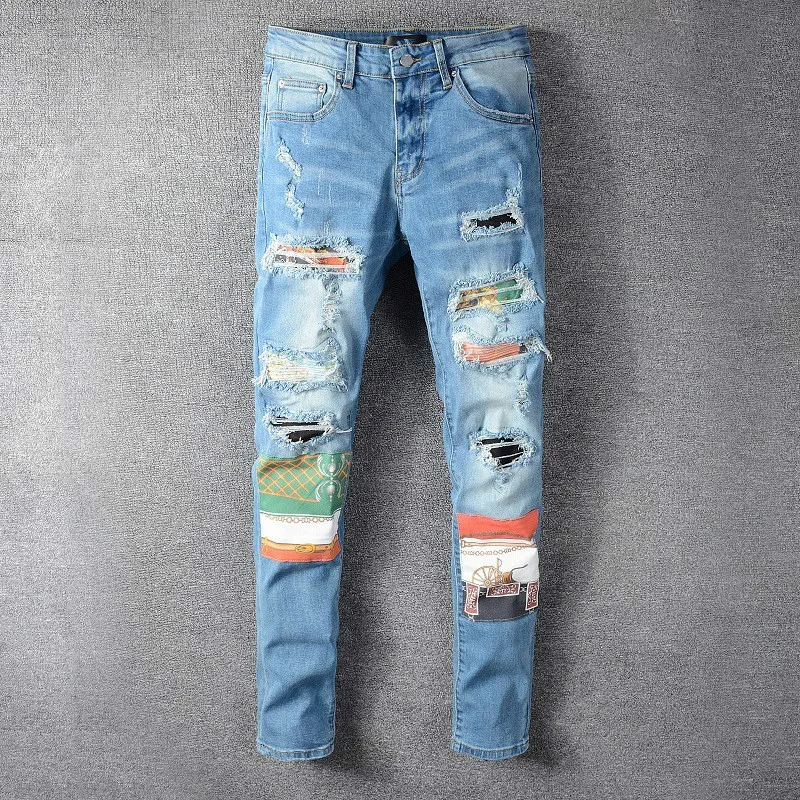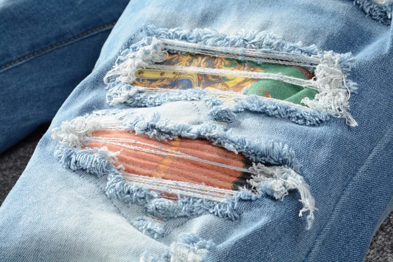 Винтаж лоскутное отверстия синие джинсы Для мужчин Slim Fit дизайнерские Королевский узор Джинсы Брюки Для мужчин большие Размеры в стиле хип-хоп вечерние джинсовые брюки