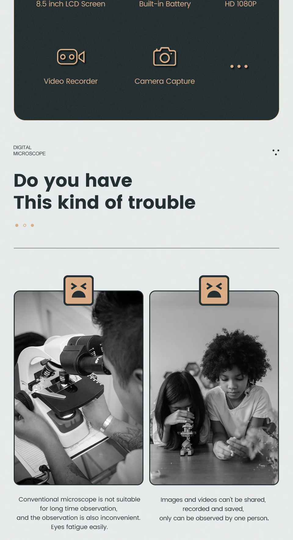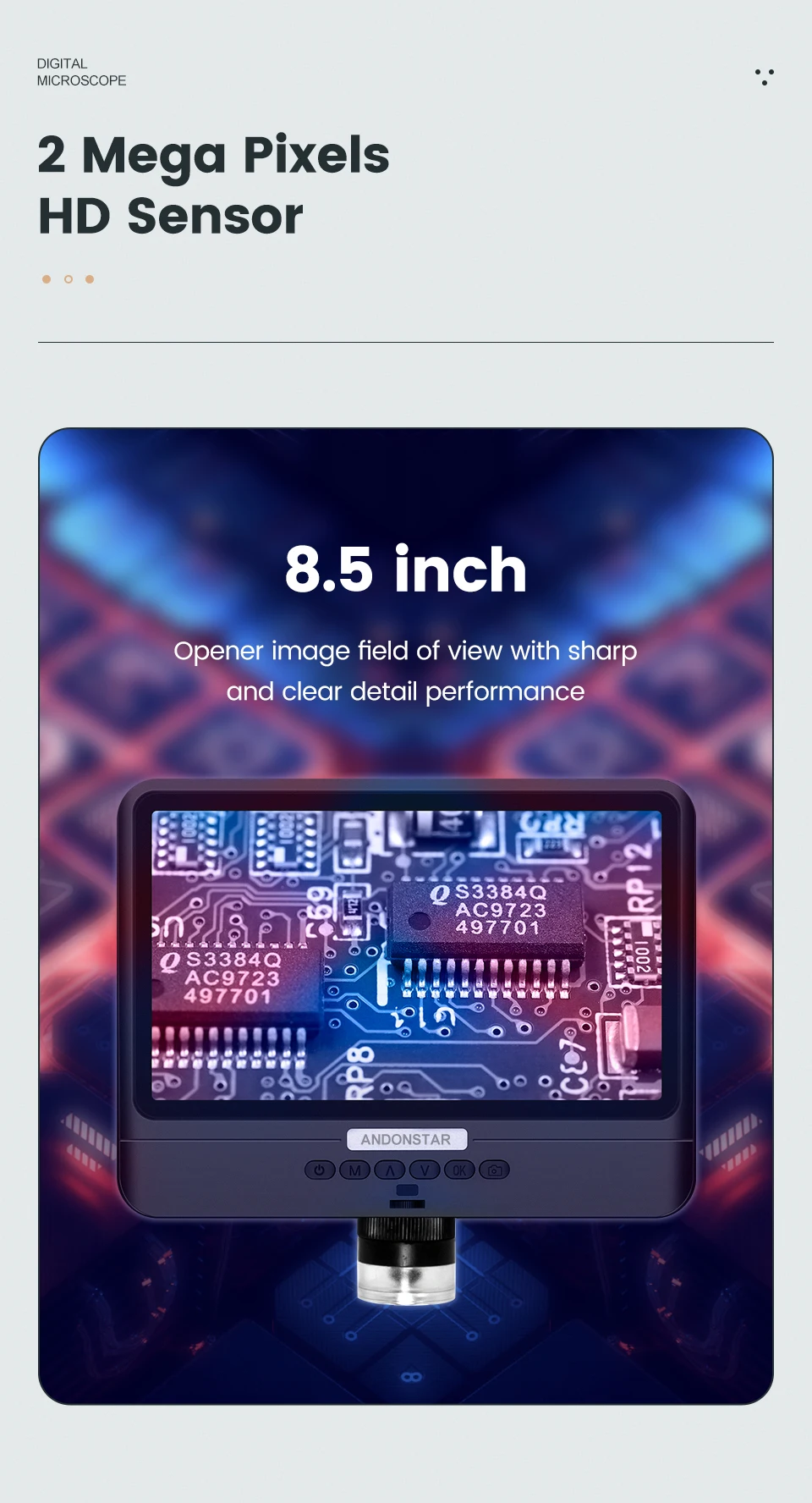 Рассматривал модель с HDMI выходом и эту. На момент заказа по данной модели ни отзывов ни обзоров. Продавец посоветовал приобрести новинку, сославшись что монитор микроскопа 8,5" не нуждается в доп. мониторе, да и цена на 11.11 с купонами была интересной. Посылка пришла в конце ноября совместно с др. заказами. Коробка не помята, упаковано стандартно, хотя просил продавца упаковать получше, чтоб монитор не разбился. Что касаемо самого микроскопа, то тут все отлично (цена, качество, увеличение, изображение, сборка). Есть даже возможность работы от одного аккамулятора 18650 и просто через USB. Но есть и минусы. Как уже писали тут: это небольшой засвет монитора в полной темноте, но стоит немного включить подсветку и все, засвета не видно. И матрица не по размеру рамки. Правая часть матрицы закрывается рамкой на 5-10 мм, что не до конца отображает значки на экране. Это конечно мелочь, на изображение не влияет, но кому как. Так же не продумано защитное стекло. Придется колхозить самому.