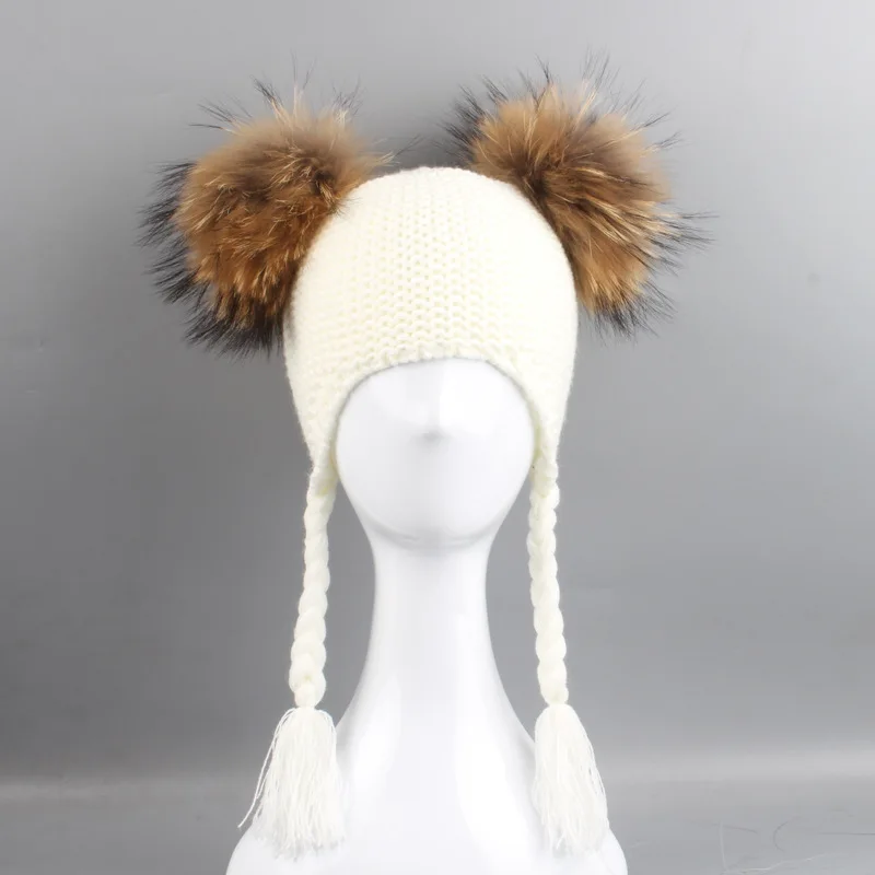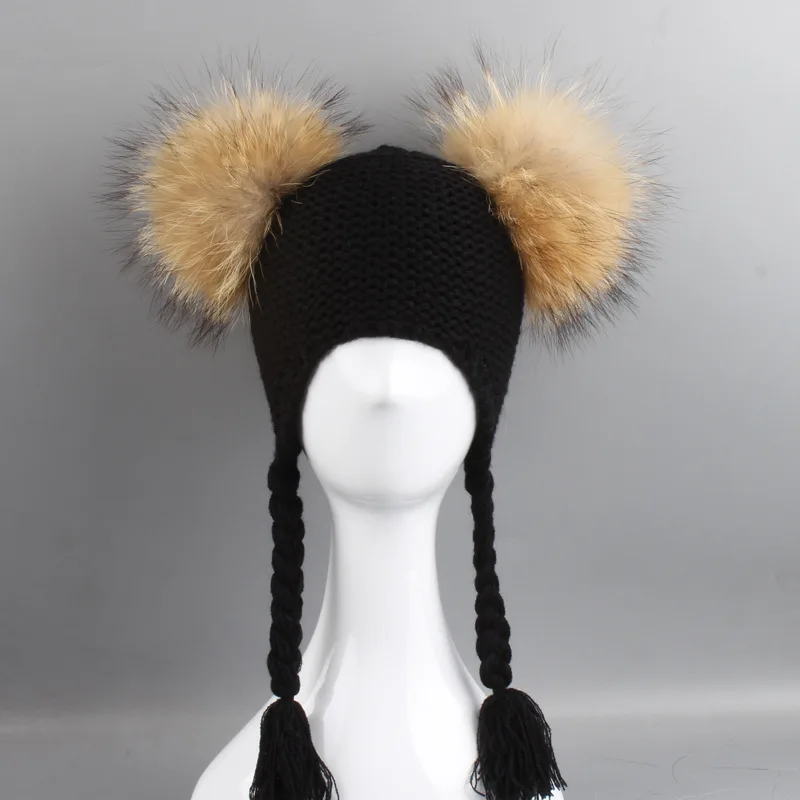 Осенне-зимняя шапка для маленьких девочек из натурального енота с двойным помпоном, вязаная шапка для детей, Детский чепчик
