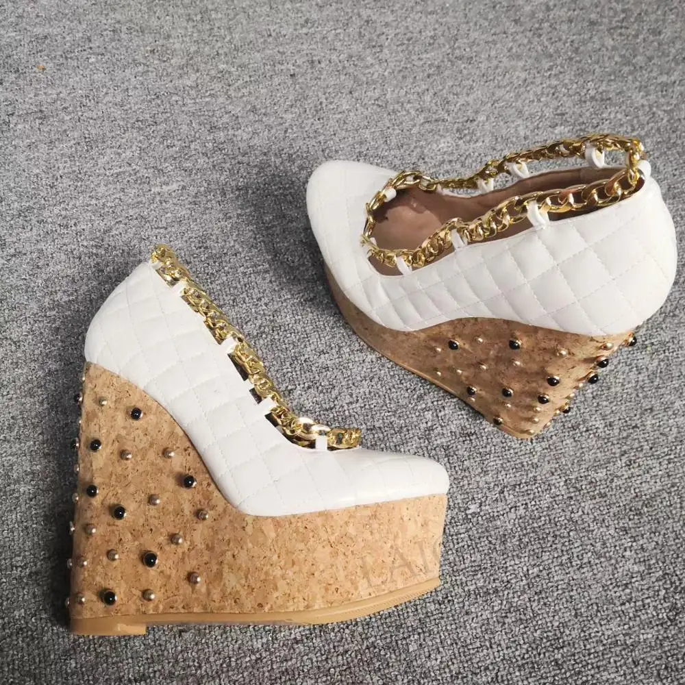 BERZIMER Women Platform Wedges StuddedHeels Pumps Faux Leather Chains Party Zapatos Ladies Shoes Woman Large Size 44 45 46 52