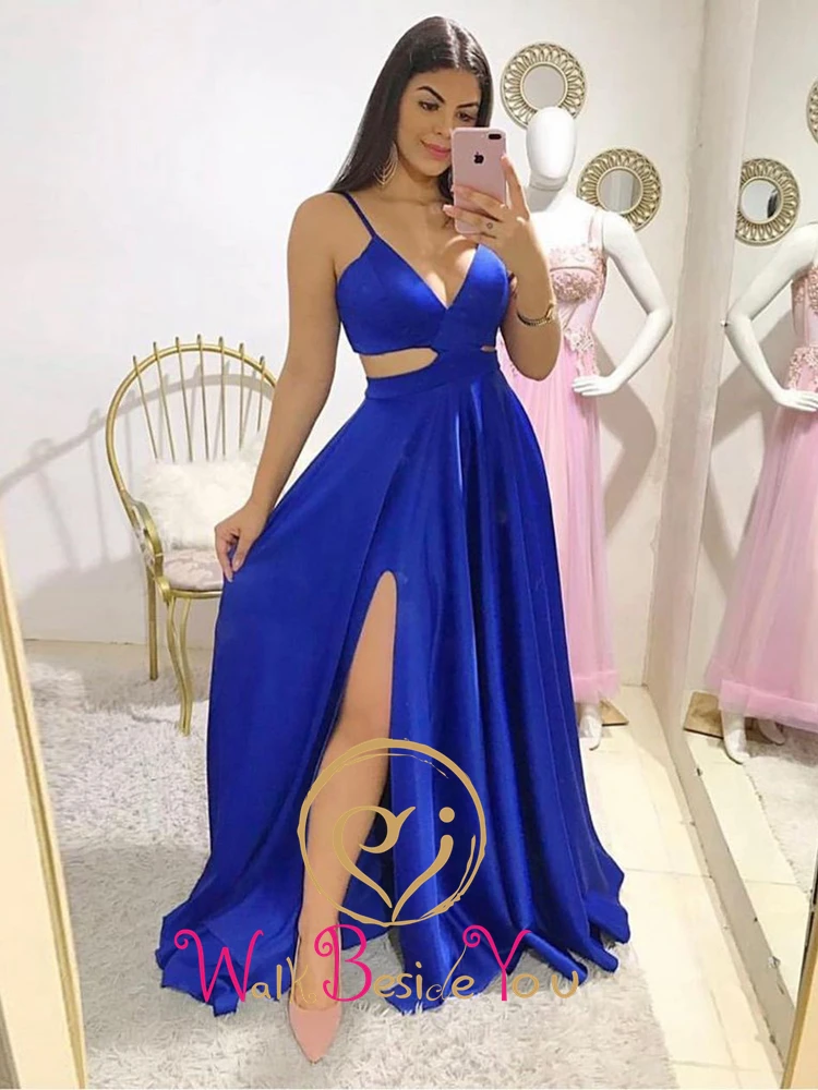 Женское атласное платье с разрезом спереди, длинное вечернее платье с V-образным вырезом, вырезом на талии и разрезом спереди, 2020