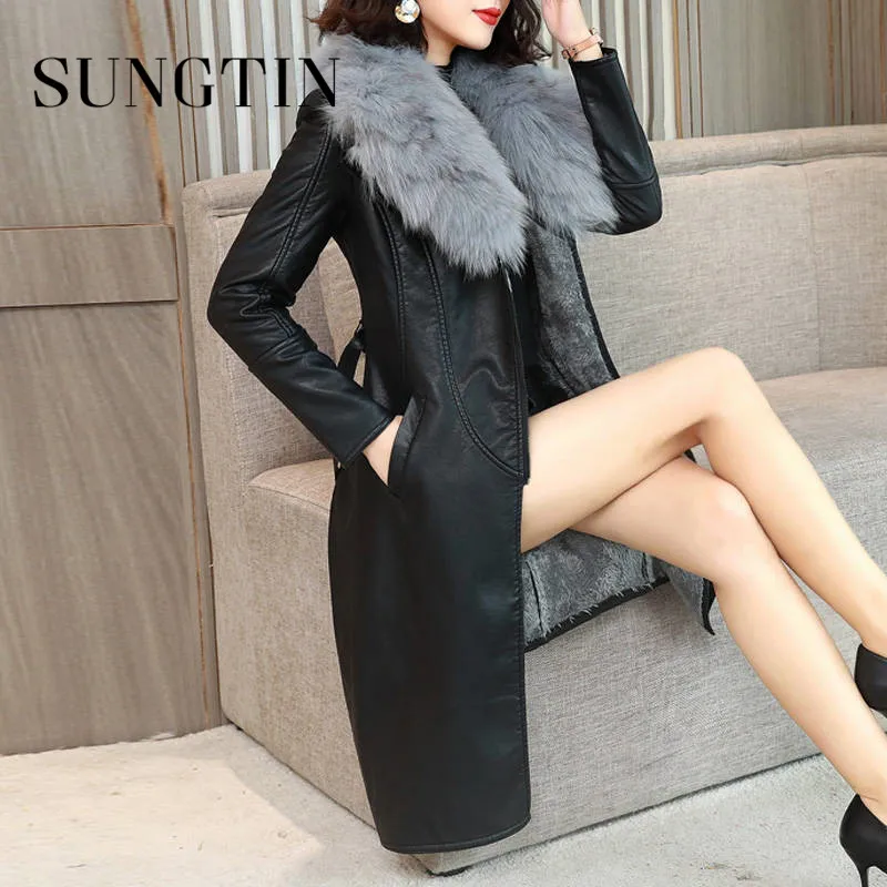 Куртка женская из искусственной кожи с длинным рукавом и меховым воротником