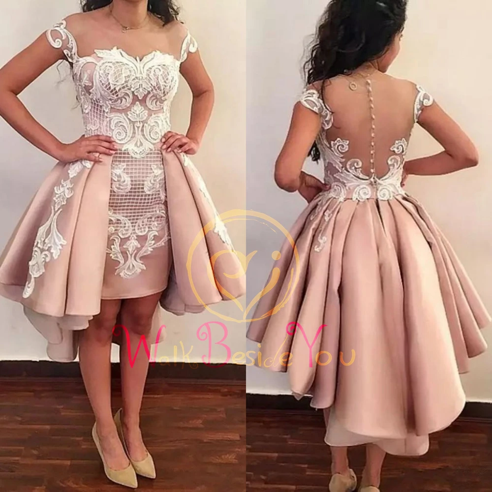 Из прозрачной ткани платья для выпускного вечера 2021 розового цвета с аппликацией из кружева атласный короткое спереди и длинное сзади трапециевидной формы Чай Длина вечерние платья Кепки рукава на заказ
