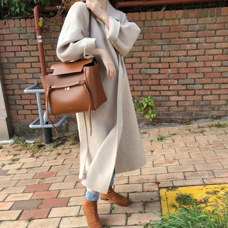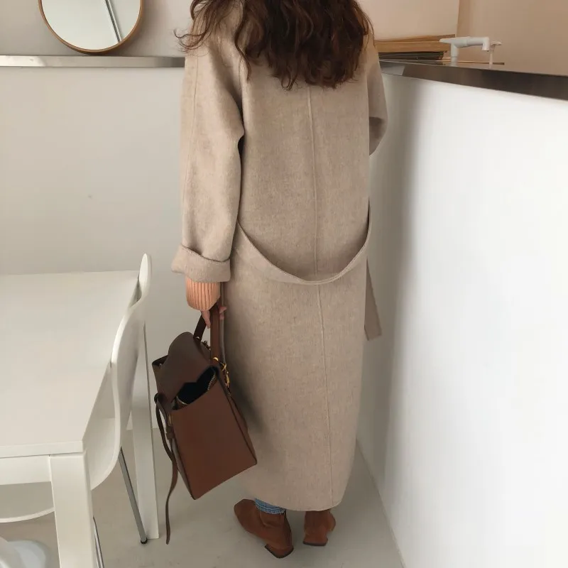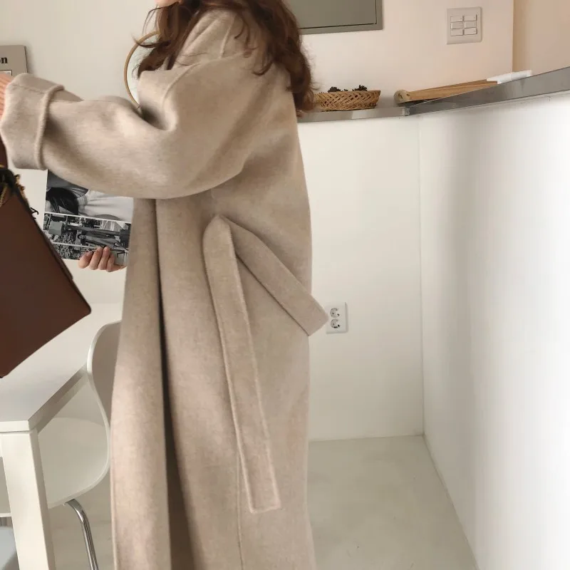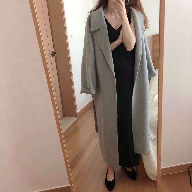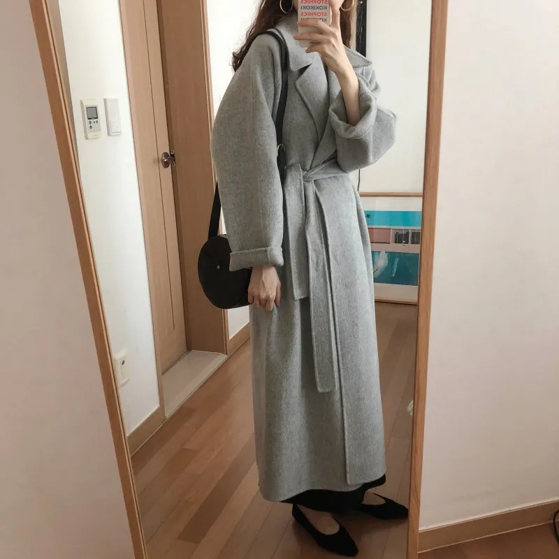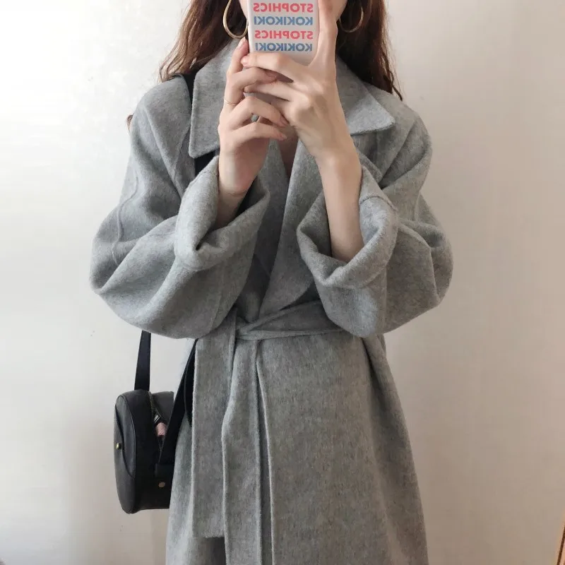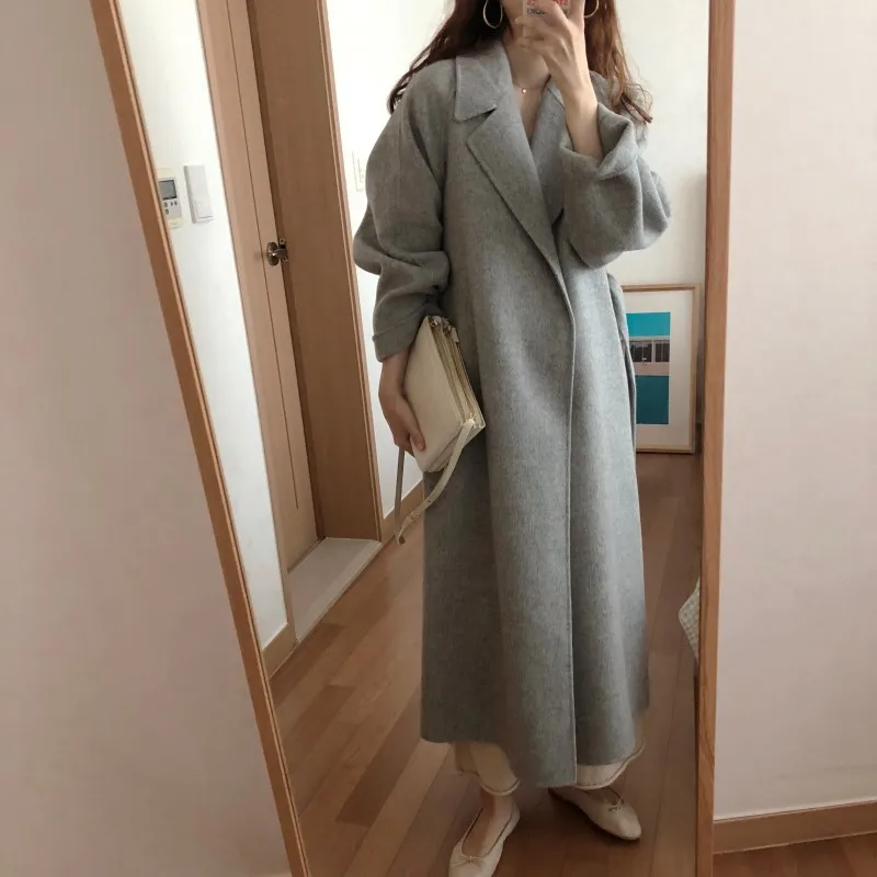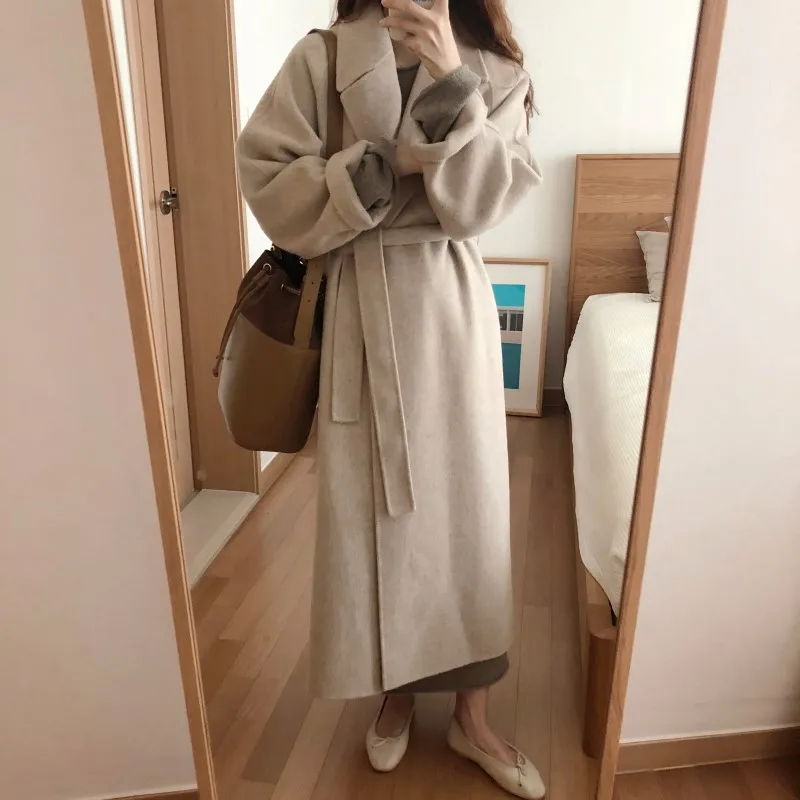 Женское кашемировое шерстяное пальто SMTHMA, осенне-зимнее винтажное пальто с отложным воротником и поясом, длинная верхняя одежда
