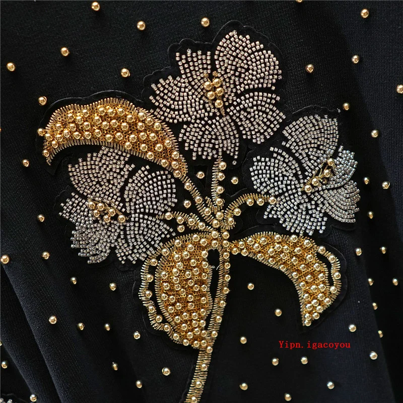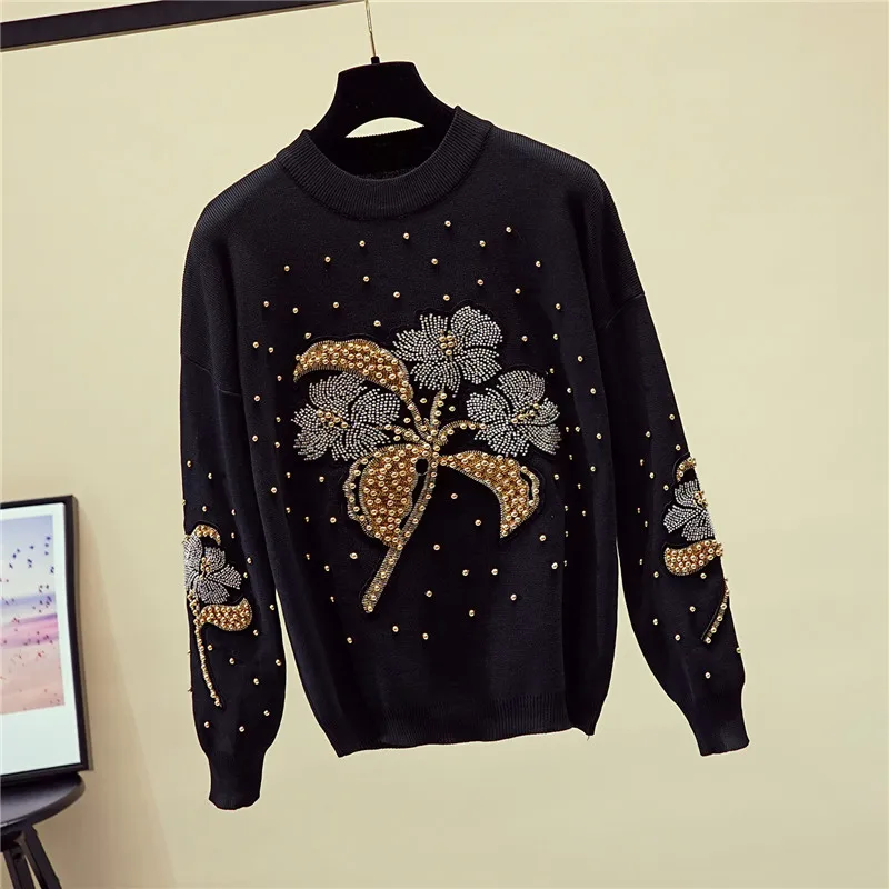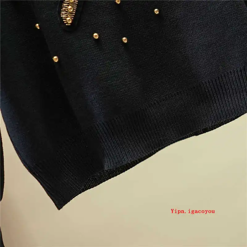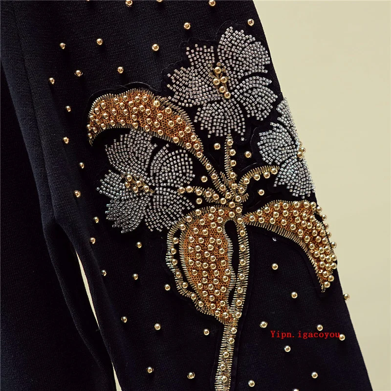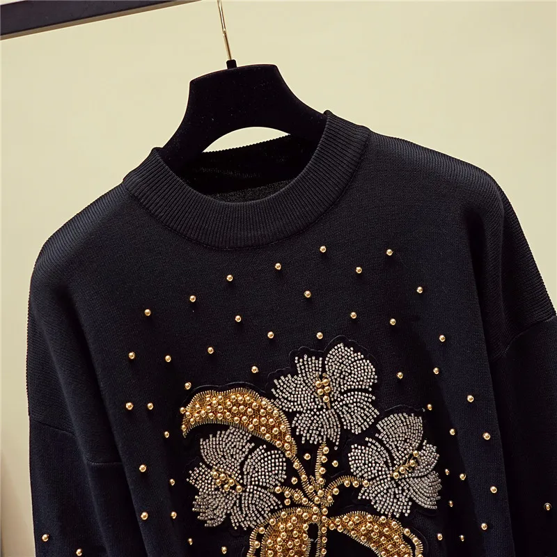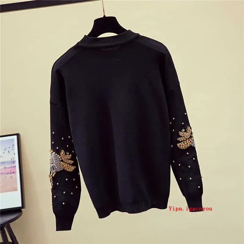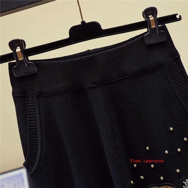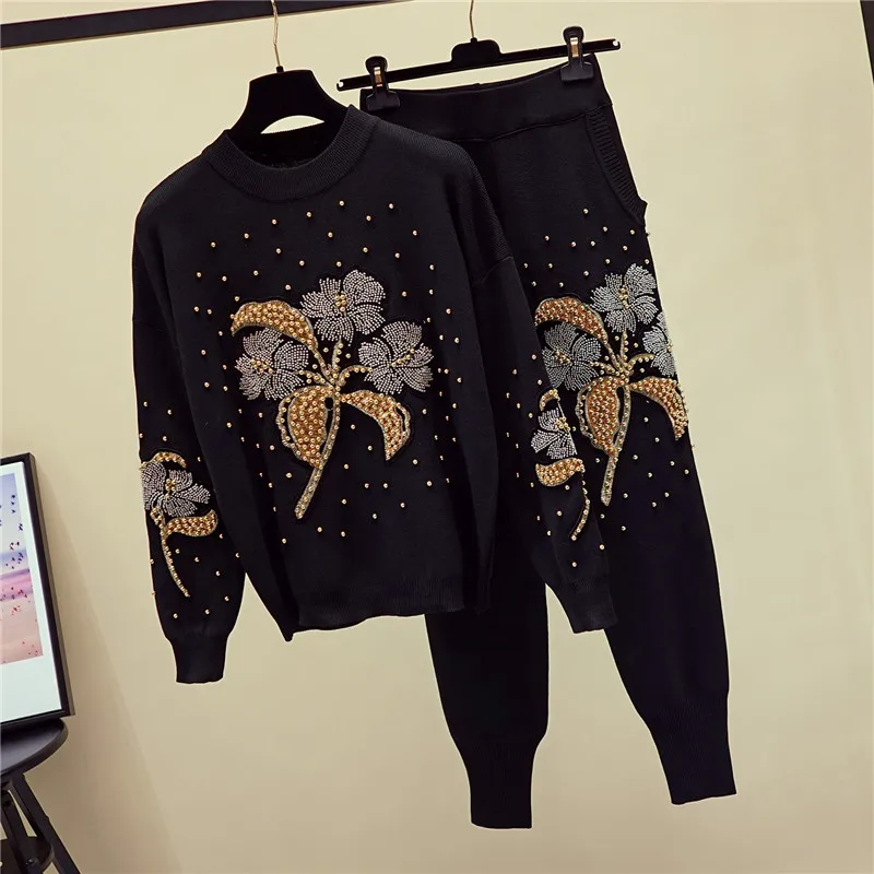 Осенний Женский комплект из двух предметов, вязаные брюки-карандаш с бисером, женский свободный черный пуловер, вязаные брюки, костюм