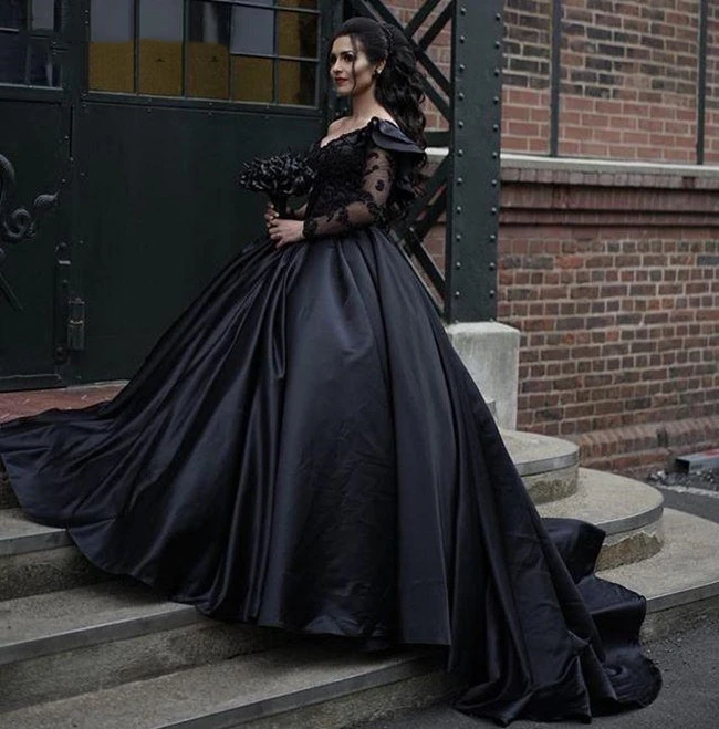 Винтажное черное свадебное платье принцессы на одно плечо с длинным рукавом и кружевной аппликацией в стиле ретро, готическое атласное официальное свадебное платье для помолвки