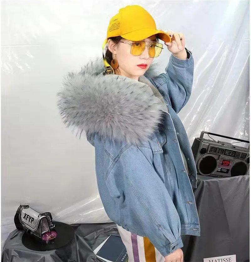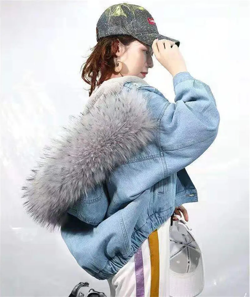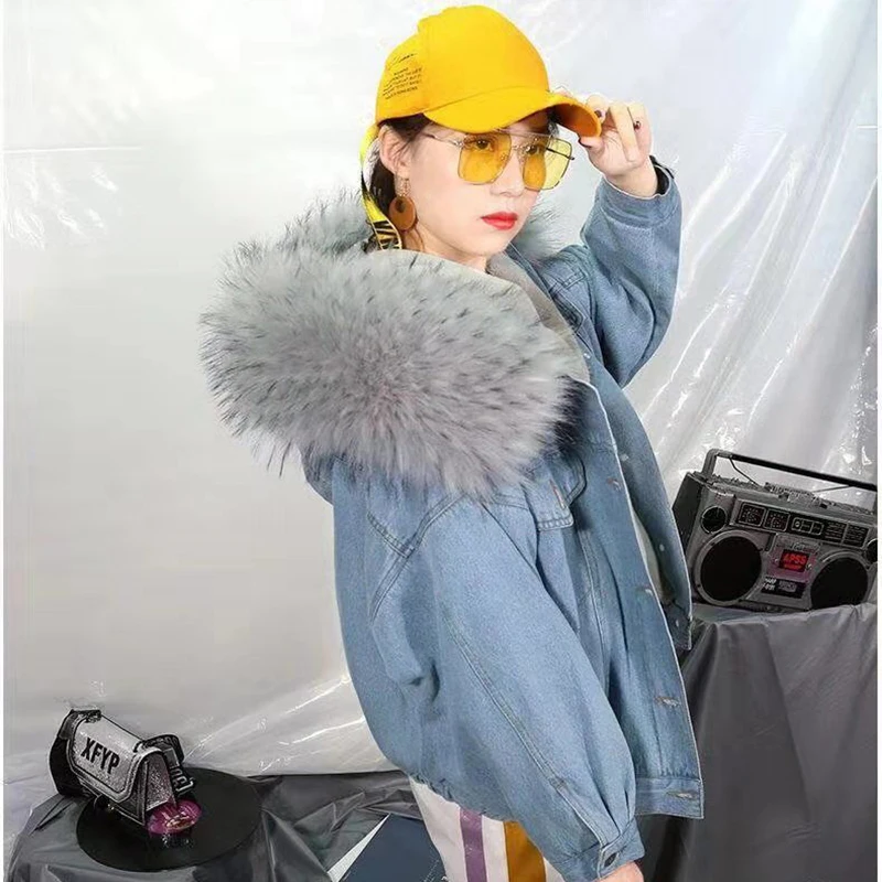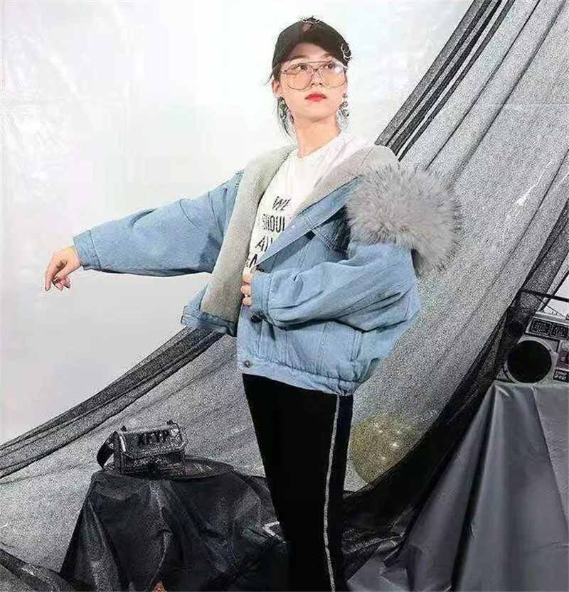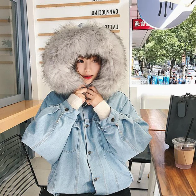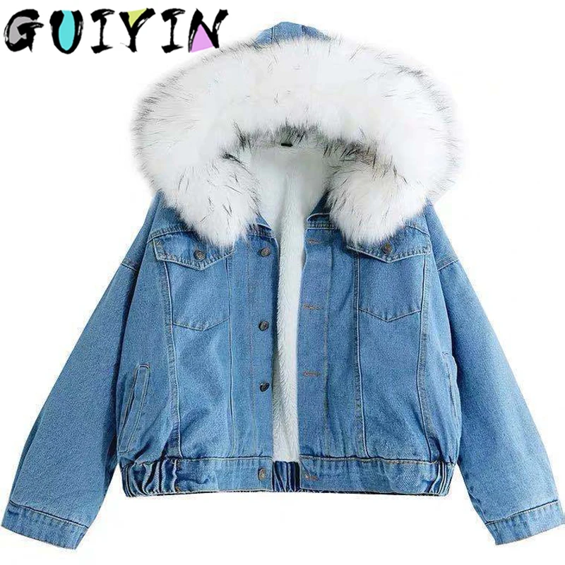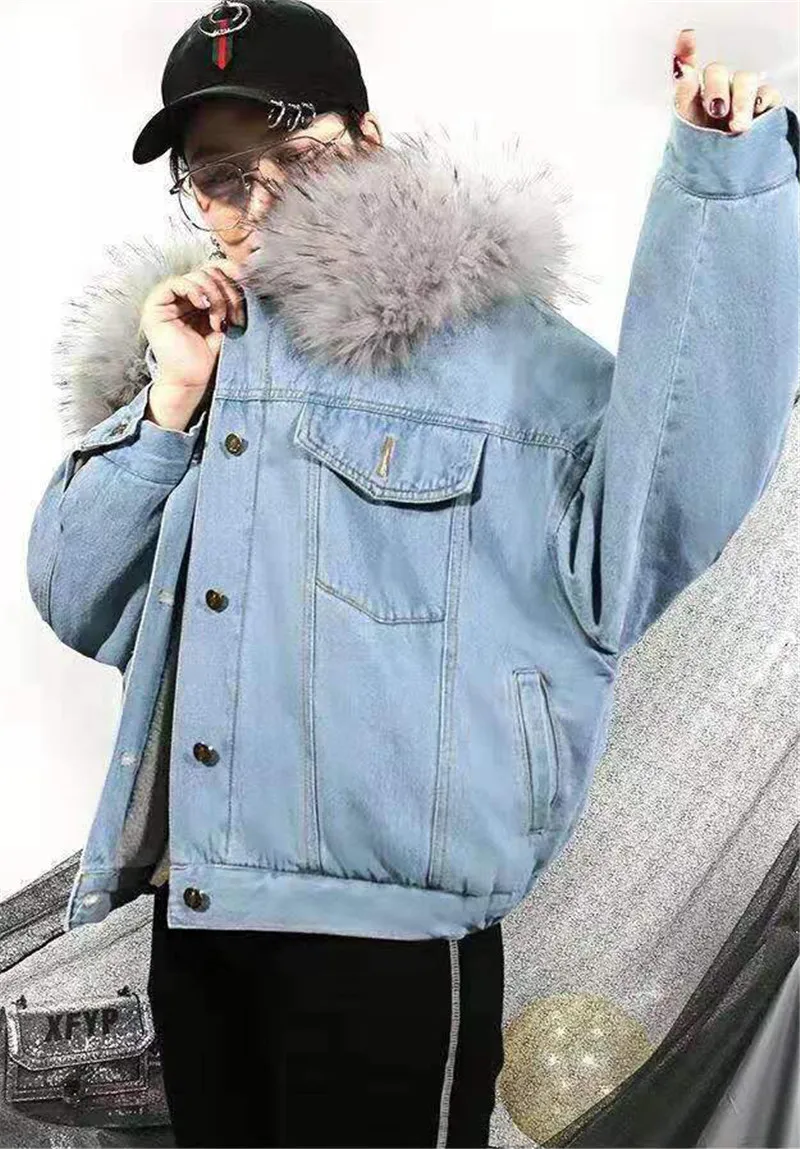 Женская джинсовая куртка, свободная утепленная куртка с большим мех...