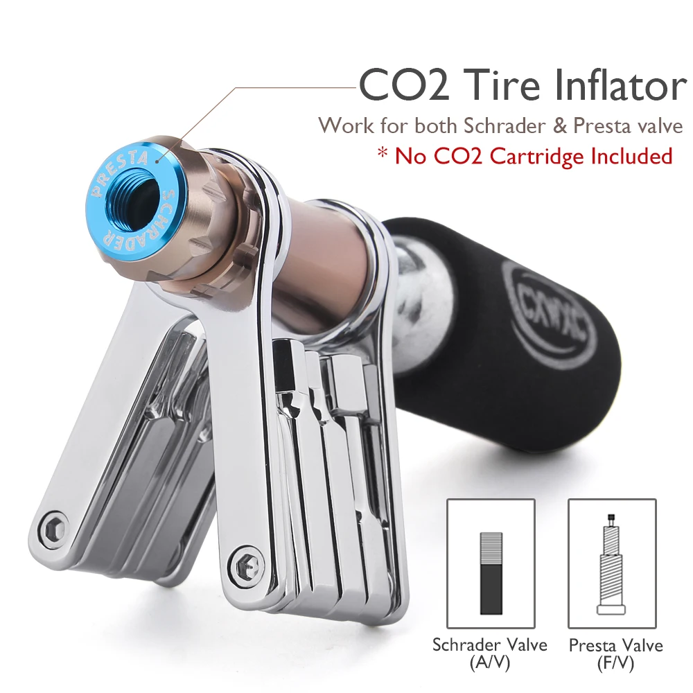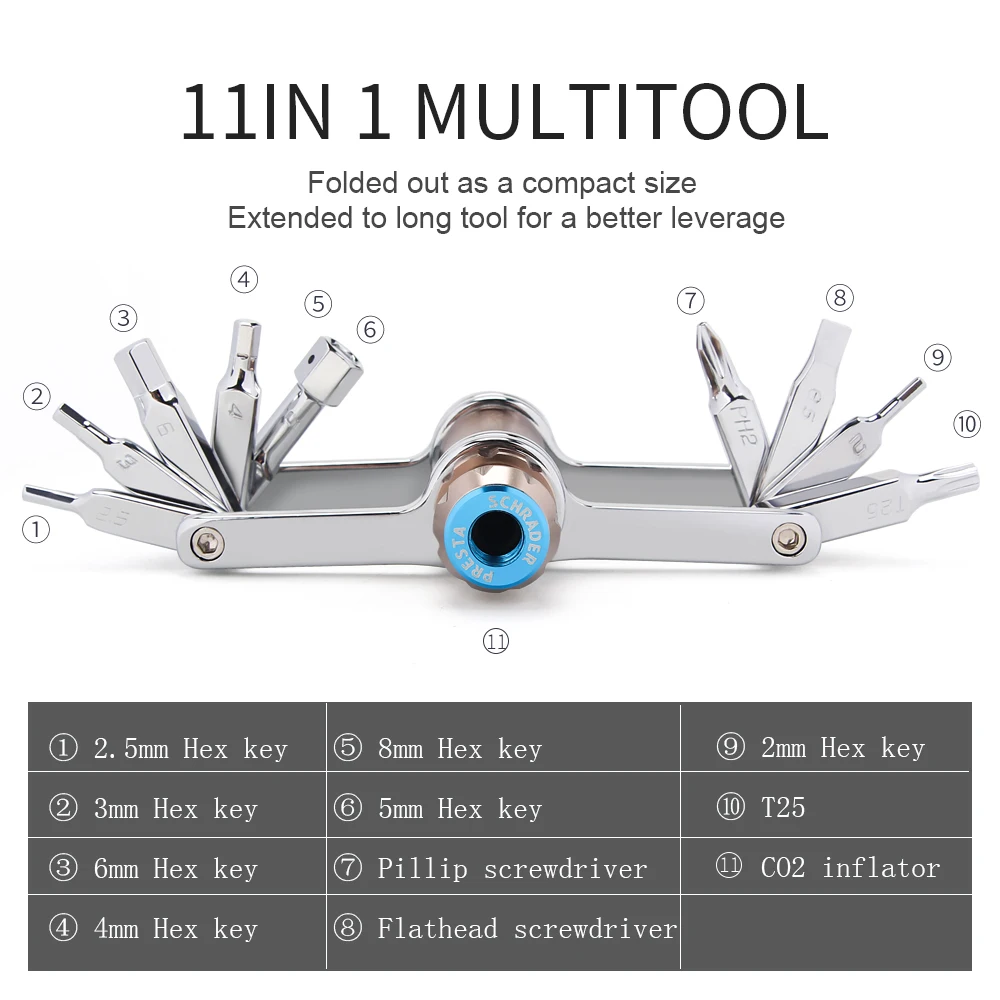-Шестигранный ключ (2,2.5,3,4,5,6,8 мм), Torx driver(T-25), Phillip и flathead отвертка, СО2 шинный насос (без СО2 картриджа в комплекте), оснащен каждым практичным инструментом, который вам нужен.