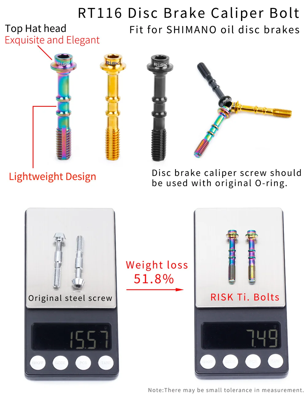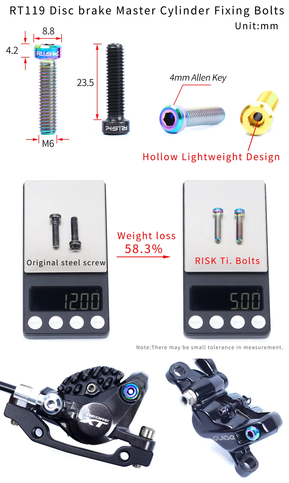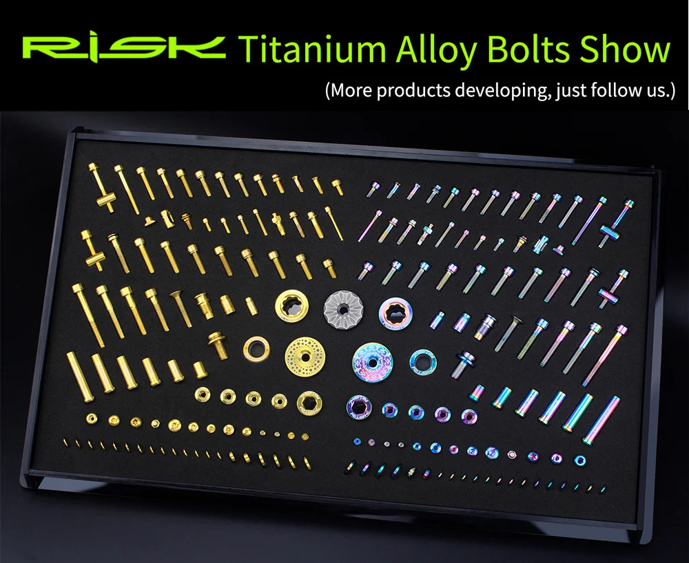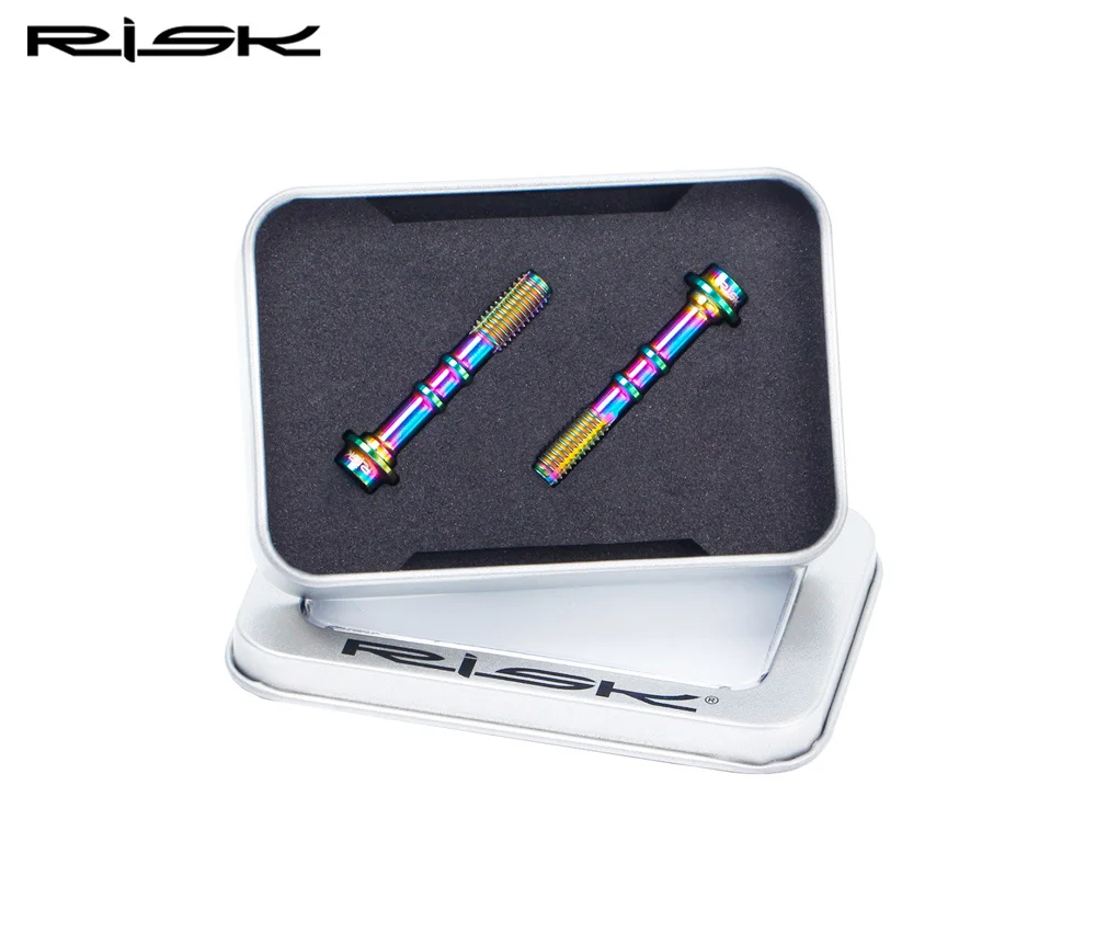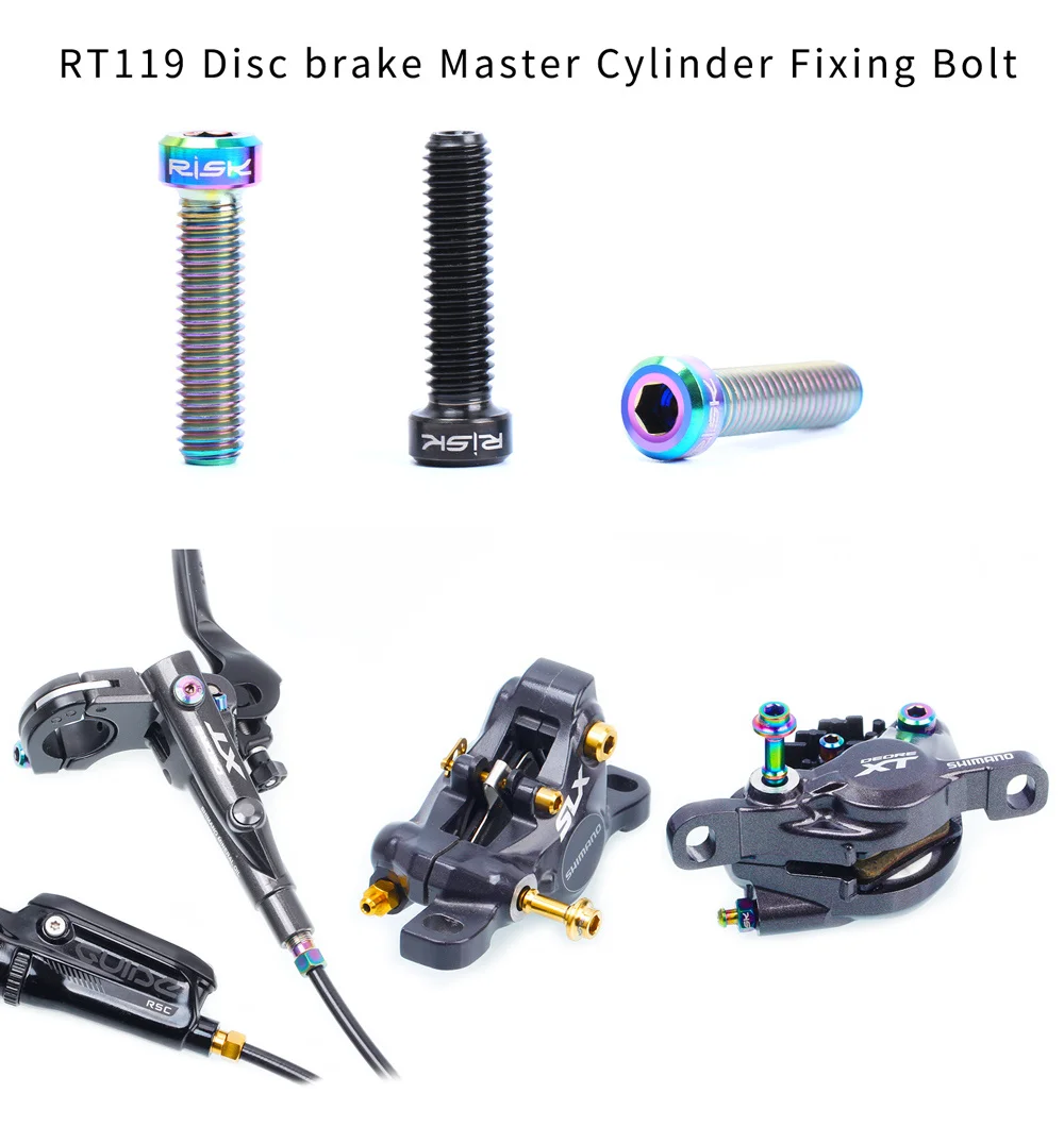 Информация о продукте: Бренд: RISK Название: болты для велосипедных масляных дисков Модель: RT114 / RT115 / RT116 / RT118 / RT119 Материал: титановый сплав TC4 Подходит: SHIMANO все серии масляных дисков или Sram Guider или DB серии Упаковка: 2 шт./кор. RT114-болты для сосков: Подходит: Универсальный для всех серий масляных дисков SHIMANO. RT115 - M8 компрессионная Гайка: Подходит не только для всех серий масляных дисков SHIMANO, но и для серий Sram Guider и нефтяных дисков серии DB Размер: M8 * 0,75 (наружный диаметр резьбы 8 мм, расстояние резьбы 0,75 мм). Пожалуйста, проверьте размер вашего велосипеда перед покупкой. RT116-Дисковый тормозной суппорт болт: Подходит: для SHIMANO XTR M785/ 8000/ 9000/9200 RT118 - M4 фиксатор Pin: Подходит: для всех серий масляных дисков SHIMANO с резьбовым отверстием и направляющими масляными дисками Sram Размер: M4 * 26 мм с зажимом Советы: его можно использовать, если длина подходит. Это не имеет значения, если он немного длиннее, чем оригинал. RT119-главный тормозной цилиндр, крепежные болты: Подходит для всех серий дисков SHIMANO split oil и направляющих Sram. Размер: M6 * 23,5 мм Советы: диаметр резьбы должен быть M6, но длина близка к 23,5 мм