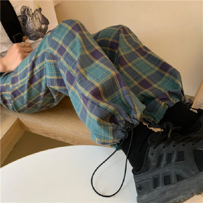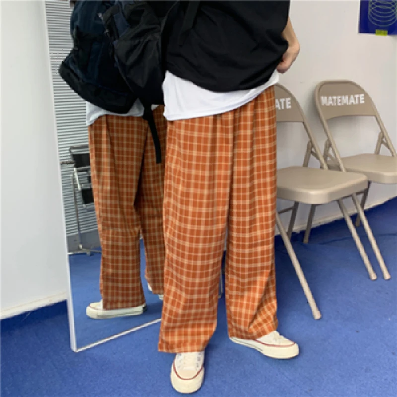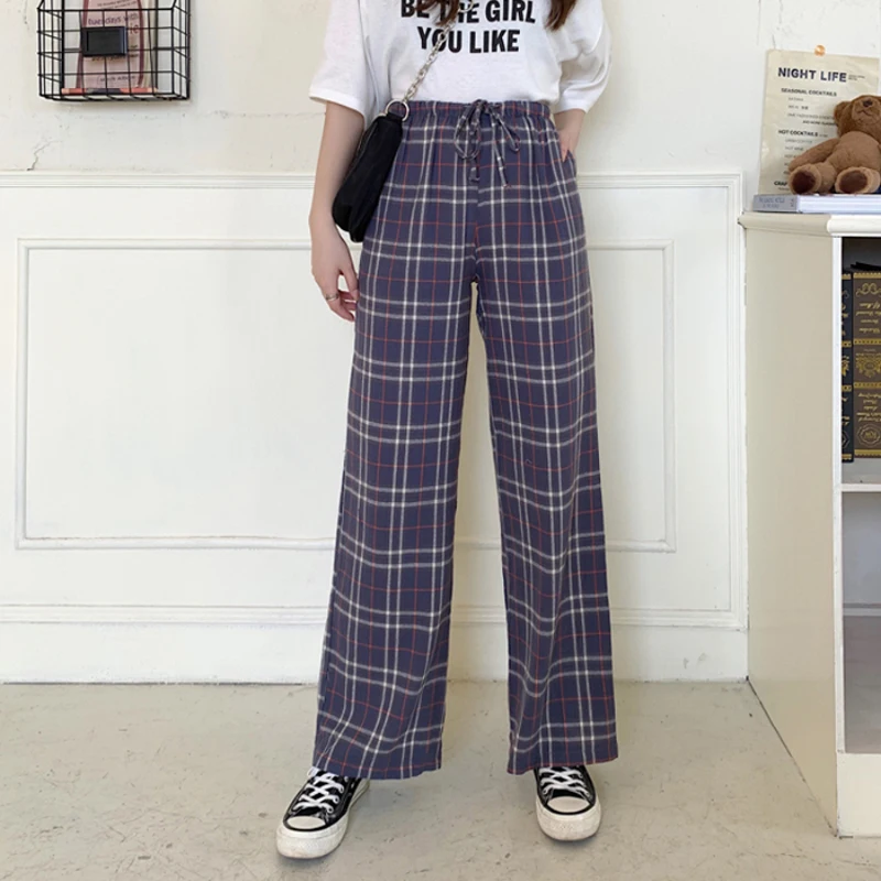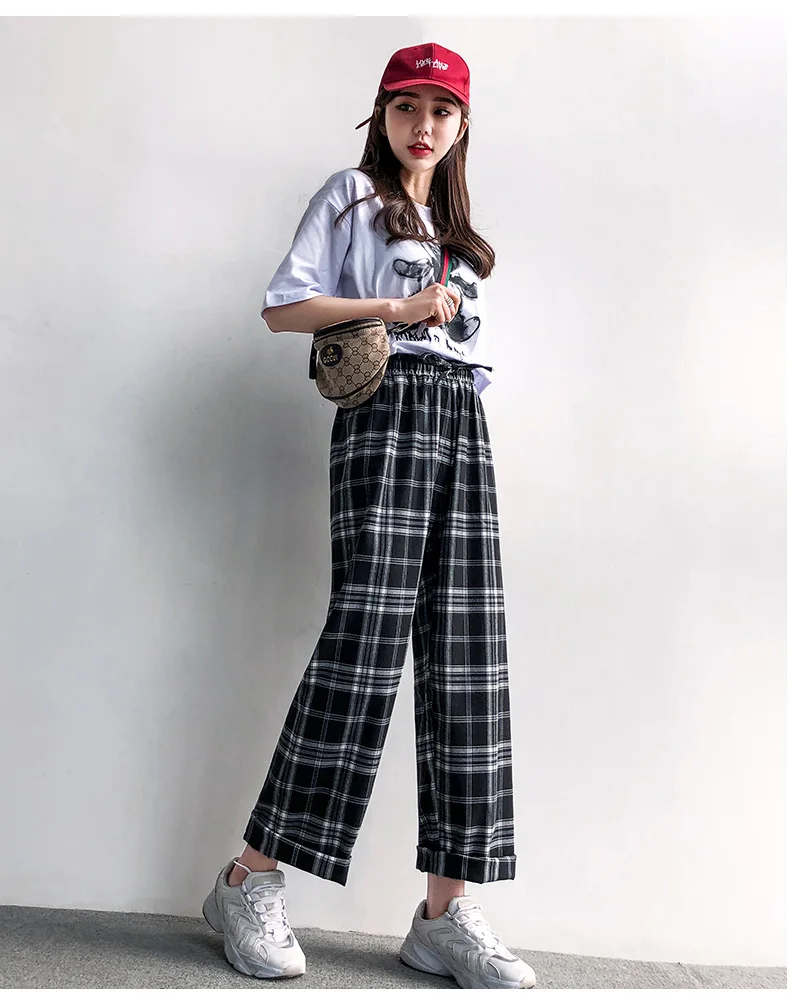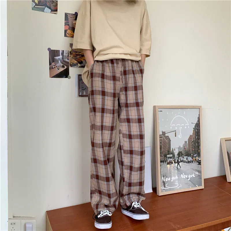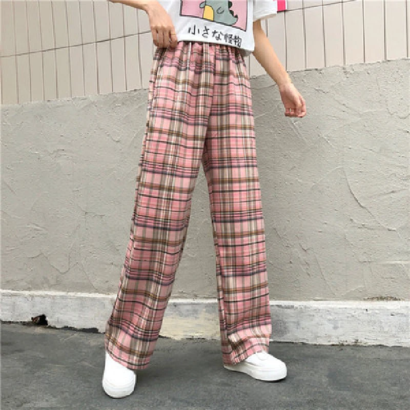Брюки женские в клетку с завышенной талией, эластичные черные свободные брюки с широкими штанинами, в стиле Харадзюку, повседневные Прямые Штаны с карманами, розовые