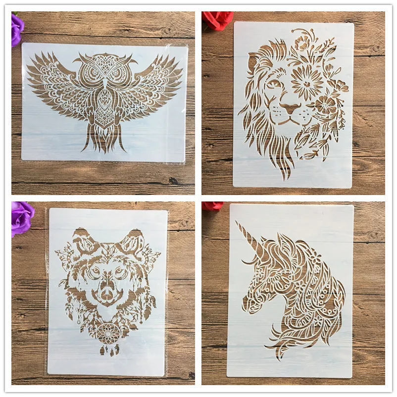 Трафарет для раскрашивания тиснение, скрапбукинг, 4 шт.компл., А4, в виде животных, совы, Льва, единорога, волка