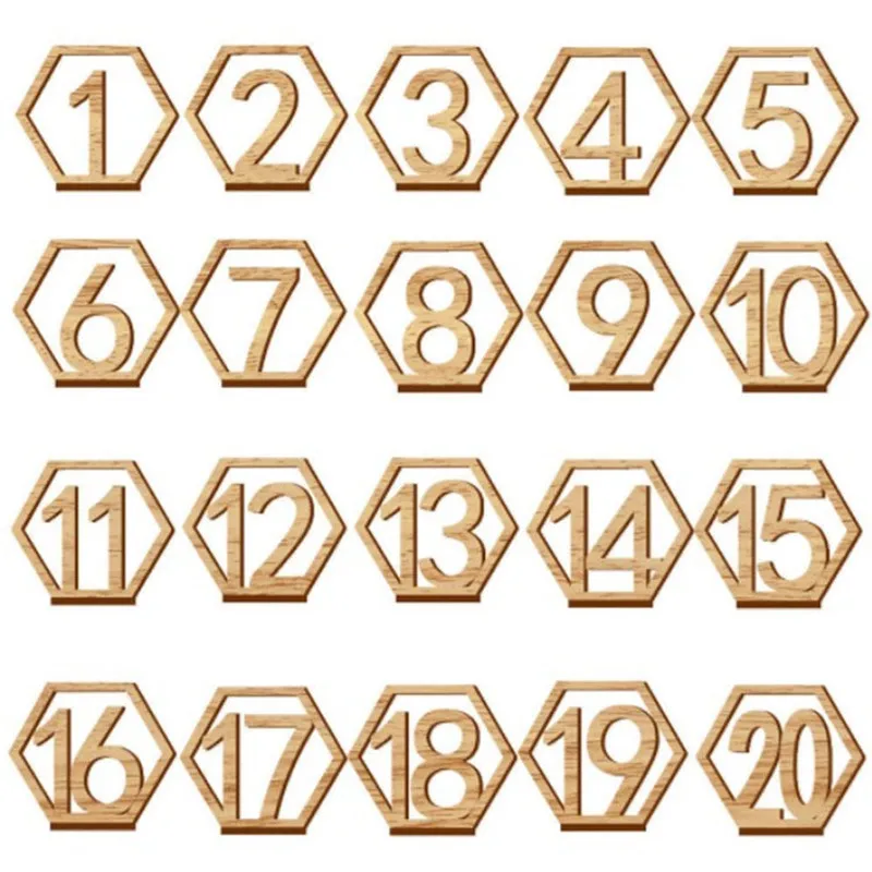 Этот товар представляет собой набор из 20 настольных номеров, что является простым способом маркировки столов на вашем приеме. В комплект входит от 1 до 20 цифр для установки сидений. С держателем, его можно легко положить на гостевые столы. Полый шестиугольник в форме, шикарный и художественный. Подходит для банкета, дня рождения, общественного питания, свадьбы, свадебного торжества, юбилея, вечерние, домашние мероприятия и т. д.