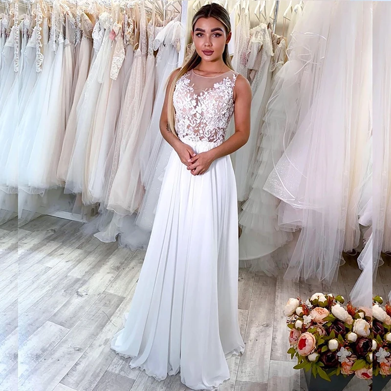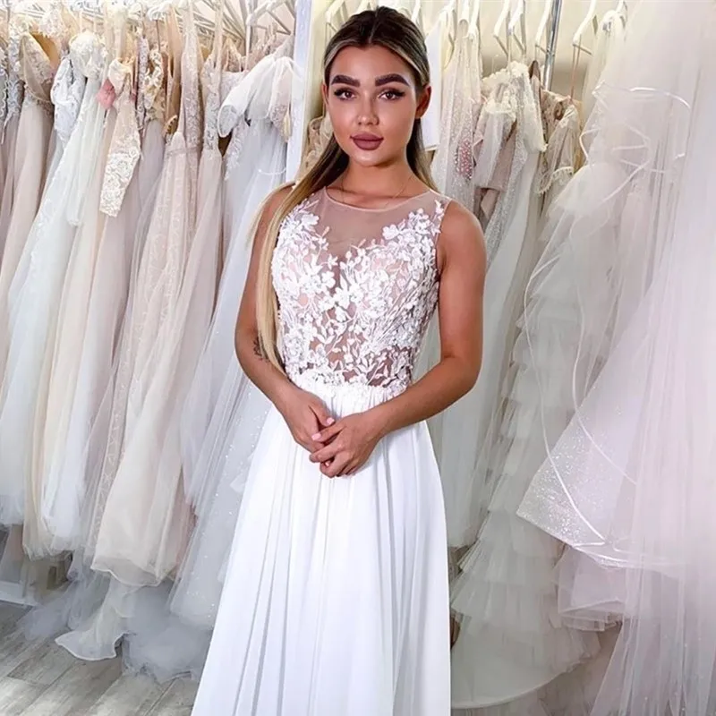 Женское свадебное платье без рукавов, белое элегантное шифоновое платье-трапеция до пола с кружевной аппликацией, очаровательное свадебное платье, 2020