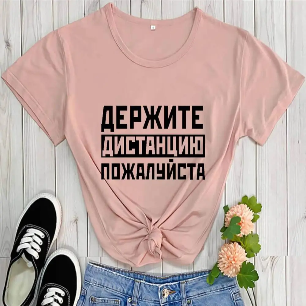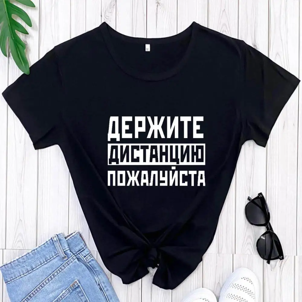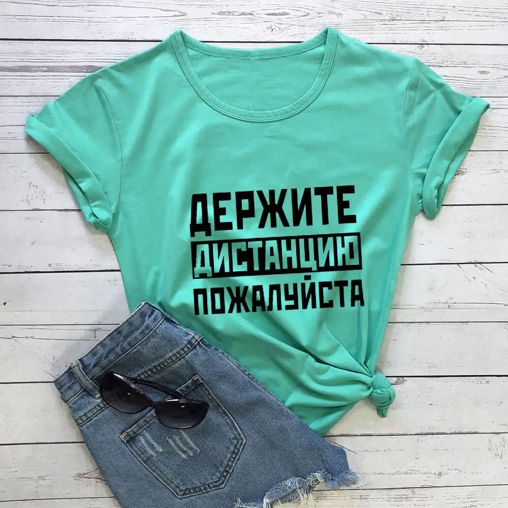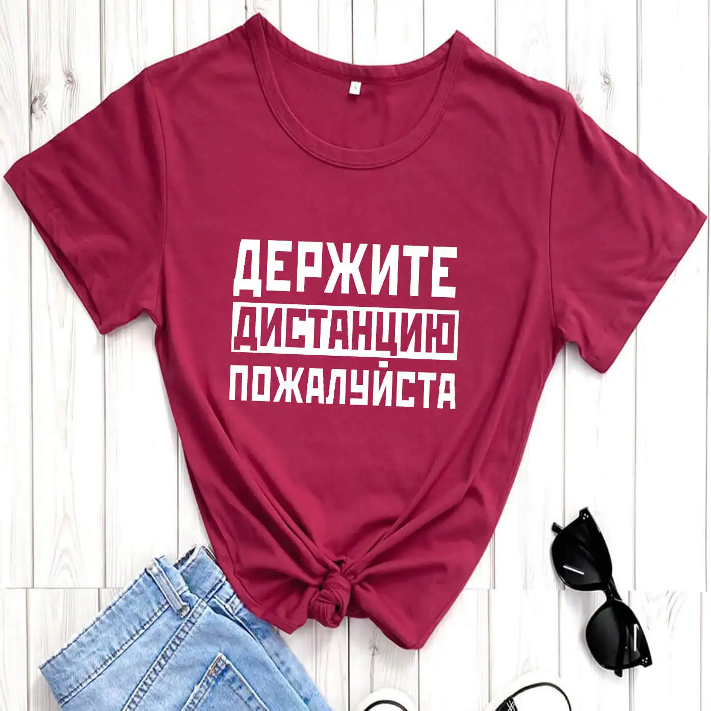 Держите дистанцию принт в виде русских букв рубашка 100% хлопок повседневная женская забавная футболка социальные удаляющиеся Топы