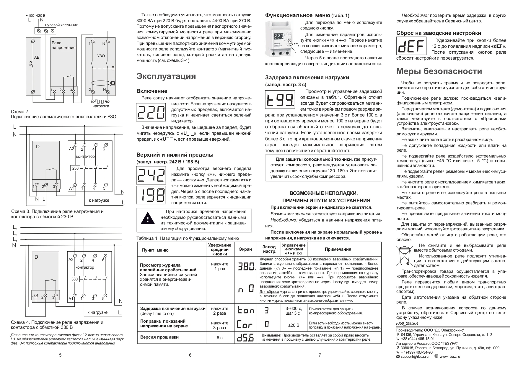 Задержка подачи нагрузкиПосле стабилизации напряжения активируется таймер задержки подачи напряжения. Вы можете настраивать его длительность от 3 до 600 с. Для оборудования, чувствительного к частым отключениям напряжения (например, для холодильников, кондиционеров и тепловых насосов), рекомендованное время задержки составляет 120-180 с.Надежность компонентов и безопасность при эксплуатацииКорпус устройств изготовлен из негорючего поликарбоната. Это повышает безопасность при использовании реле. А применение в схемотехнике немецких конденсаторов EPCOS в 3-4 раза продлевает срок службы по сравнению с аналогами других производителей.Удобная настройкаУправление устройством происходит всего лишь тремя кнопками. Цифровой экран отображает значение напряжения и системную информацию. Он помогает легко установить верхний и нижний предел допустимого напряжения, а также упрощает навигацию в меню.Легкий монтажУстановка реле напряжения осуществляется в распределительный щиток на стандартную DIN-рейку шириной 35 мм. Клеммы устройства обеспечивают надежный контакт в силовой части корпуса.