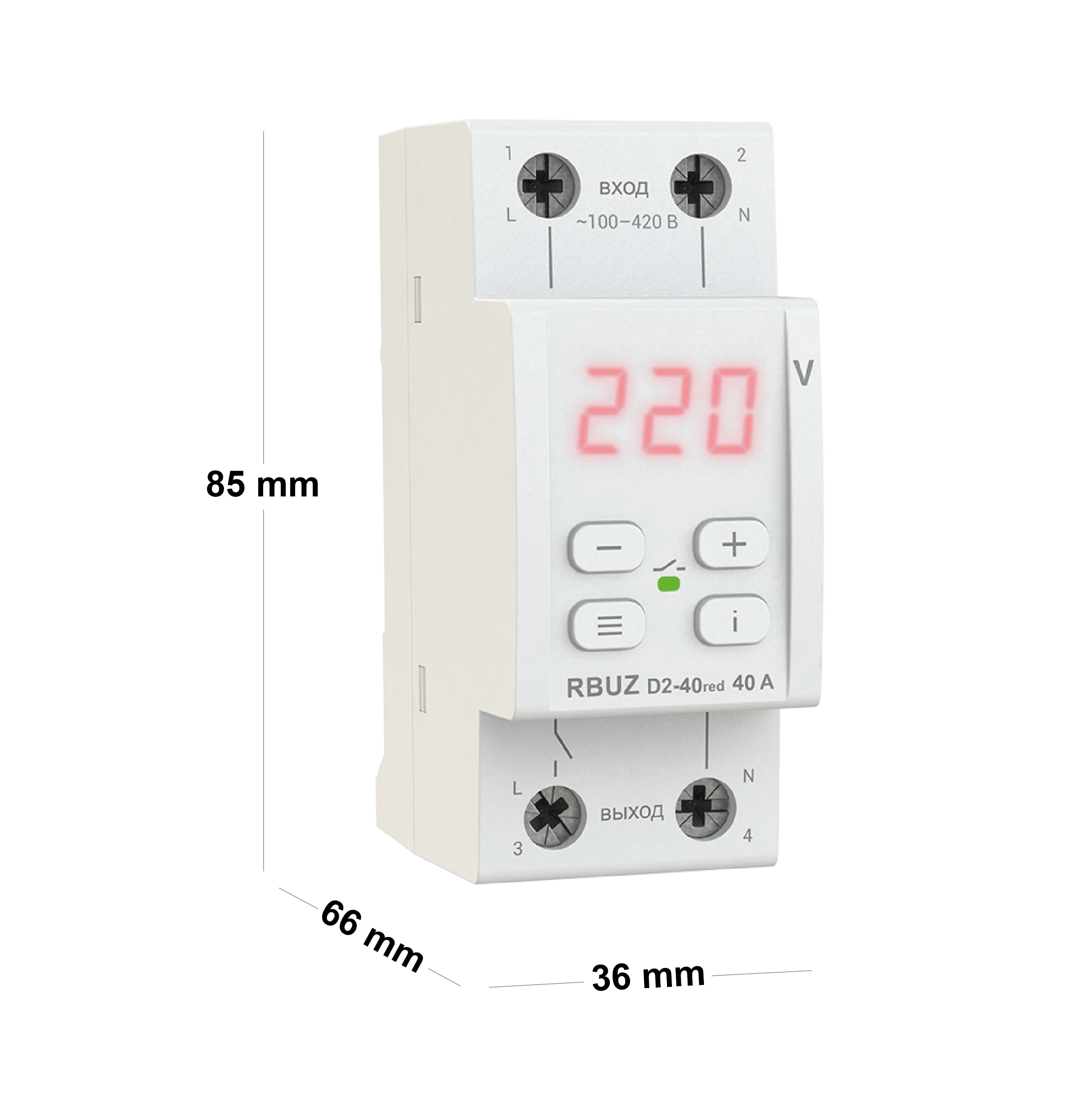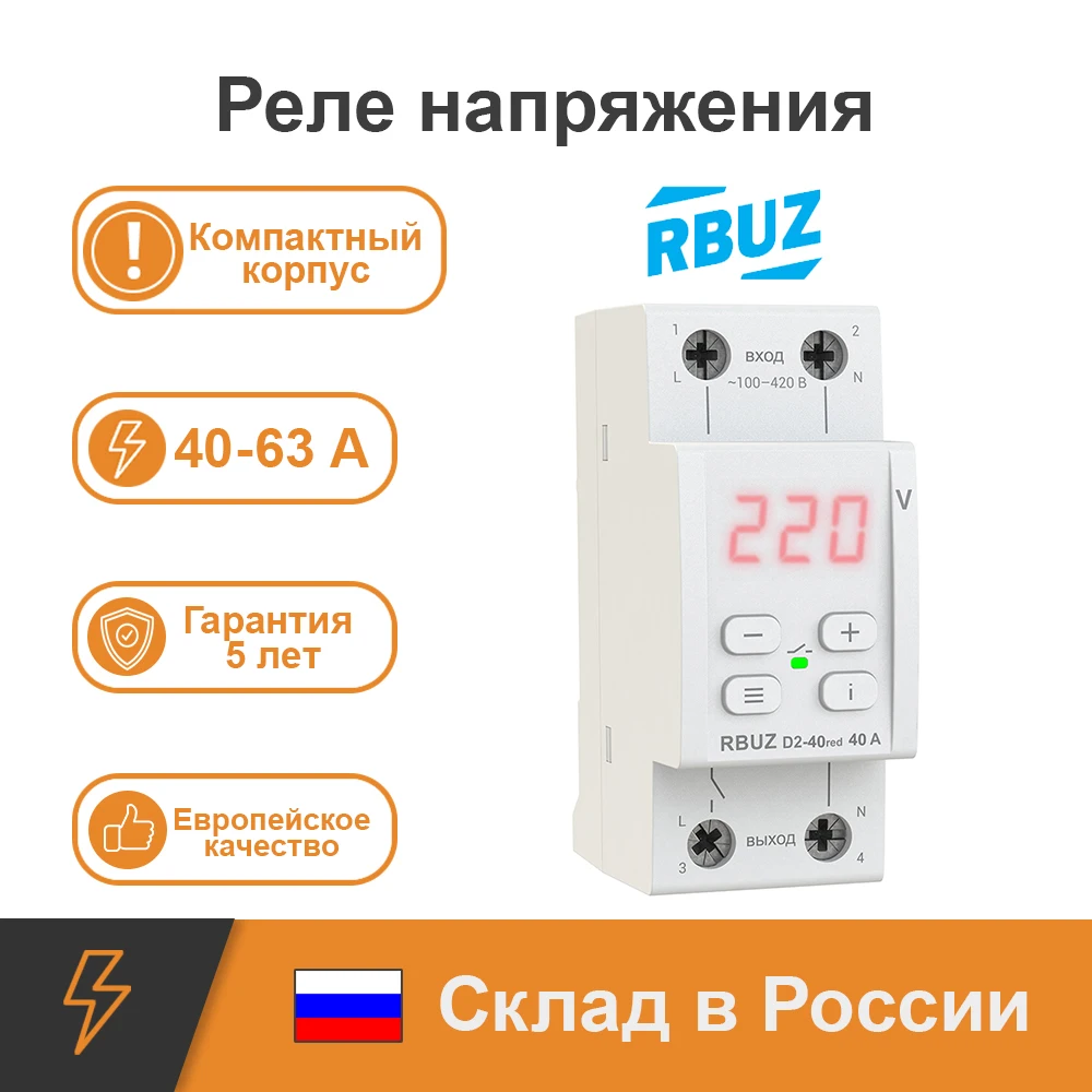 Однофазное реле напряжения в компактном корпусе с термозащитойРеле напряжения RBUZ D2 red предназначены для защиты оборудования от чрезмерных колебаний напряжения. При наступлении аварийной ситуации устройство отключает нагрузку. Реле применяются в однофазных сетях переменного тока (230 В). Дополнительно оснащено термозащитой.Высокая точность измерения TrueRMSRBUZ D2 red с высокой точностью измеряет напряжение. Принцип действия TrueRMS — алгоритм снижает влияние сетевых помех на точность измерения напряжения, когда форма напряжения отличается от синусоиды.Профессиональная модель выключения нагрузкиВы можете активировать профессиональную модель задержки времени выключения. Она позволяет не отключать оборудование при безопасных по величине и длительности отклонениях напряжения.Повышенная безопасность благодаря термозащитеРеле напряжения RBUZ D2 red оснащены защитой от перегрева. Она активируется, если температура внутри корпуса достигнет 80 °С.Задержка включения нагрузкиВ устройстве предусмотрено 2 типа включения задержки нагрузки:— когда отсчет времени до подачи нагрузки отсчитывается с момента стабилизации напряжения;— когда отсчет начинается с момента отключения реле.Время задержки можно установить от 3 до 600 с, в зависимости от типа подключенного оборудования. Для чувствительного к частым отключениям напряжения оборудования (например, для холодильников и кондиционеров) время задержки рекомендуется устанавливать на 120-180 сек. Журнал аварийных срабатыванийЖурнал способен хранить в энергонезависимой памяти 100 последних аварийных срабатываний (например, напряжение при отключении реле или срабатывание термозащиты).Удобство в управленииУ RBUZ D2 red очень удобное стандартизированное подключение вход-выход, отсутствует необходимость использования нулевой клеммы при подключении. Настройка работы устройства осуществляется с помощью всего лишь трех кнопок. Четверная кнопка "i" предназначена для просмотра журнала аварийных срабатываний и расшифровки аббревиатур пунктов меню. Цифровой экран постоянно отображает значение напряжения, а также выводит системную информацию. Доступна возможность настройки яркости экрана и индикатора в режиме ожидания.Простая установкаРеле напряжения RBUZ D2 red очень компактный, занимает 2 стандартных модуля в распределительном щите. Его монтаж происходит в распределительный щиток на стандартную DIN-рейку шириной 36 мм. Если в помещении повышенная влажность или существует вероятность попадания воды на устройство, тогда щиток должен отвечать классу защиты IP55 (согласно ГОСТ 14254).