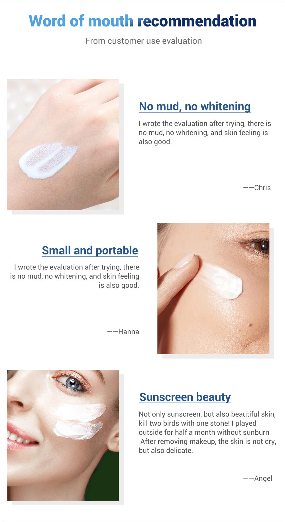 Питательные ингредиенты для кожи, защищающие от солнечных лучейАлоэ BarbadensisУвлажняющий Успокаивающий, восстанавливающий сухое покраснениеГиалуронат натрияФормирует водо-блокирующую пленку для увлажнения кожи весь деньЖемчужный порошокПитает и увлажняет, осветляет тон кожи, делает кожу гладкой и мягкойРекомендации по слову ртаОт оценки использования клиентамиБез грязи, без отбеливания