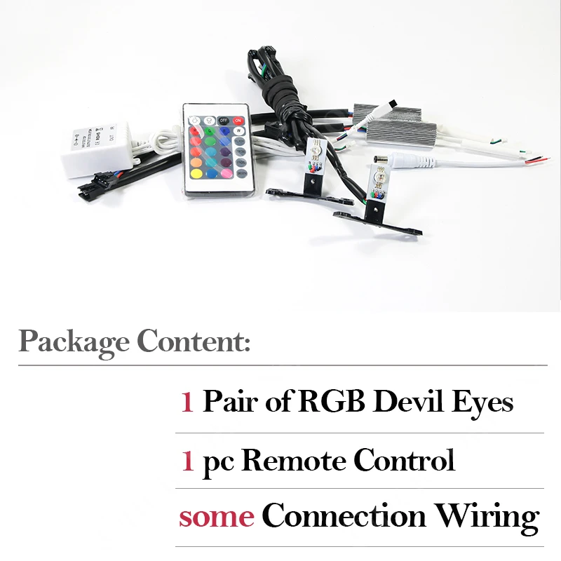 Этот продукт-разноцветные глаза демона Введение: 1. Новейшее поколение огней для глаз демона 2. Обновление для использования высококачественных лампочек. Более длительный срок службы. Яркость ярче. 3. Усовершенствованная модификация автомобиля. Эффект после модификации очень классный. 4. По-прежнему используется высоко известный традиционный пульт дистанционного управления. Нет задержки в переключении. Прост в использовании. (Стили управления приложением, продаваемые в других магазинах, часто сообщают, что мобильное приложение выходит из строя и нестабильно. Возможна задержка переключения. Не рекомендуется покупать.) 5. Это светильник 16 цветов. Посылка: 1. 1 пара глаз дьявола RGB 2. 1 шт. пульт дистанционного управления 3. Некоторые подключения проводки Подходящие модели: Подходит практически для всех автомобилей Подробности: Этот вид светодиодный глаз демона поставляется с пластиковым кронштейном с двумя отверстиями, которые легко помещаются за линзой проектора Mini H1, чтобы ваш автомобиль выглядел красивыми глазами дьявола. Многоцветные глаза дьявола. Один глаз дьявола с 16 видами цветов s Подходит для любого автомобиля. Грузовик. Фары для проектора мотоциклов Переключите управление дальним и ближним светом, чтобы изменить цвет глаз дьявола Его можно использовать и на всех проекторах. Но вам, возможно, придется снять скобы и использовать клей или что-то, чтобы зафиксировать его на проекторах.