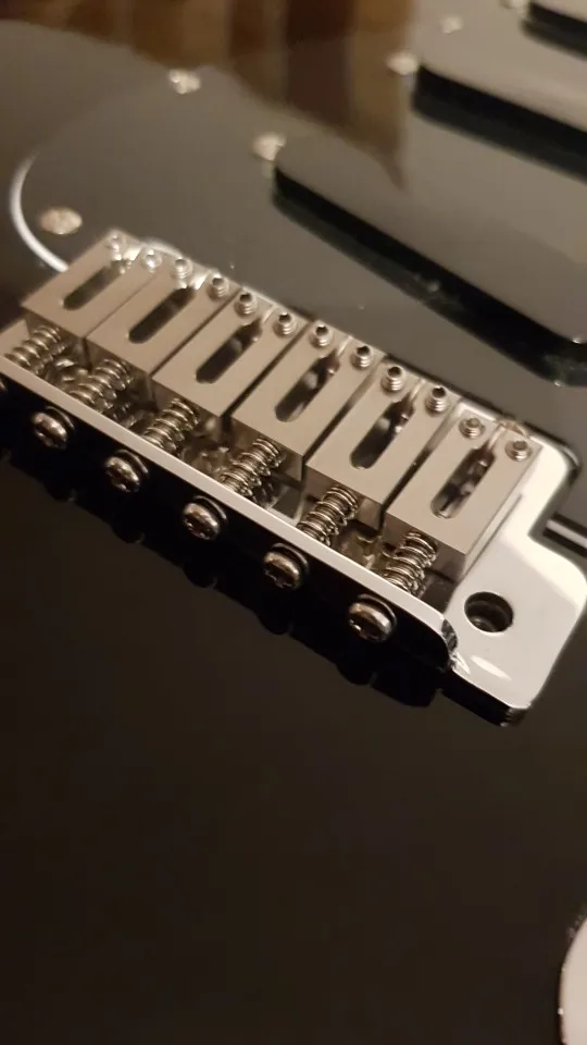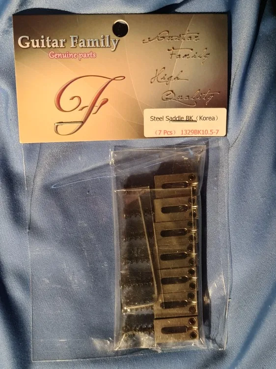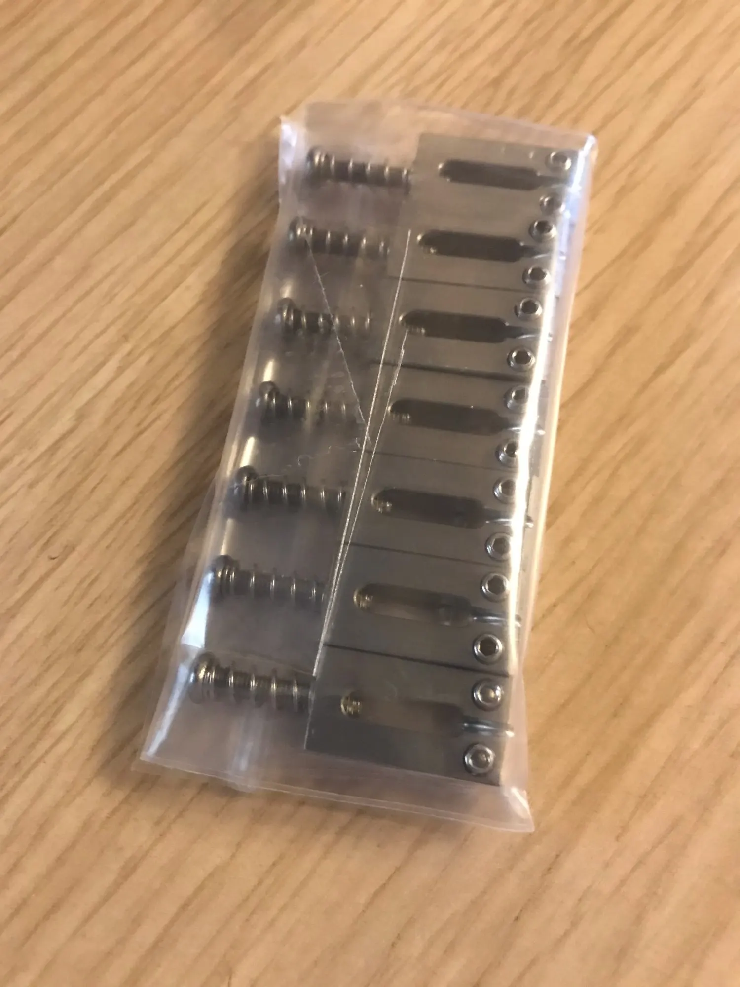Очень доволен этим, очень качественная обработка и изготовлено из немагнитной нержавеющей стали (i.e austenitic), поэтому, вероятно, класс 304 или 316. Каждое седло (со всеми винтами) весит 7 граммов, что является приятным весом. Еще не установлен, но я надеюсь, что они улучшат тон по сравнению с более дешевыми стандартными седлами от кальмаров.