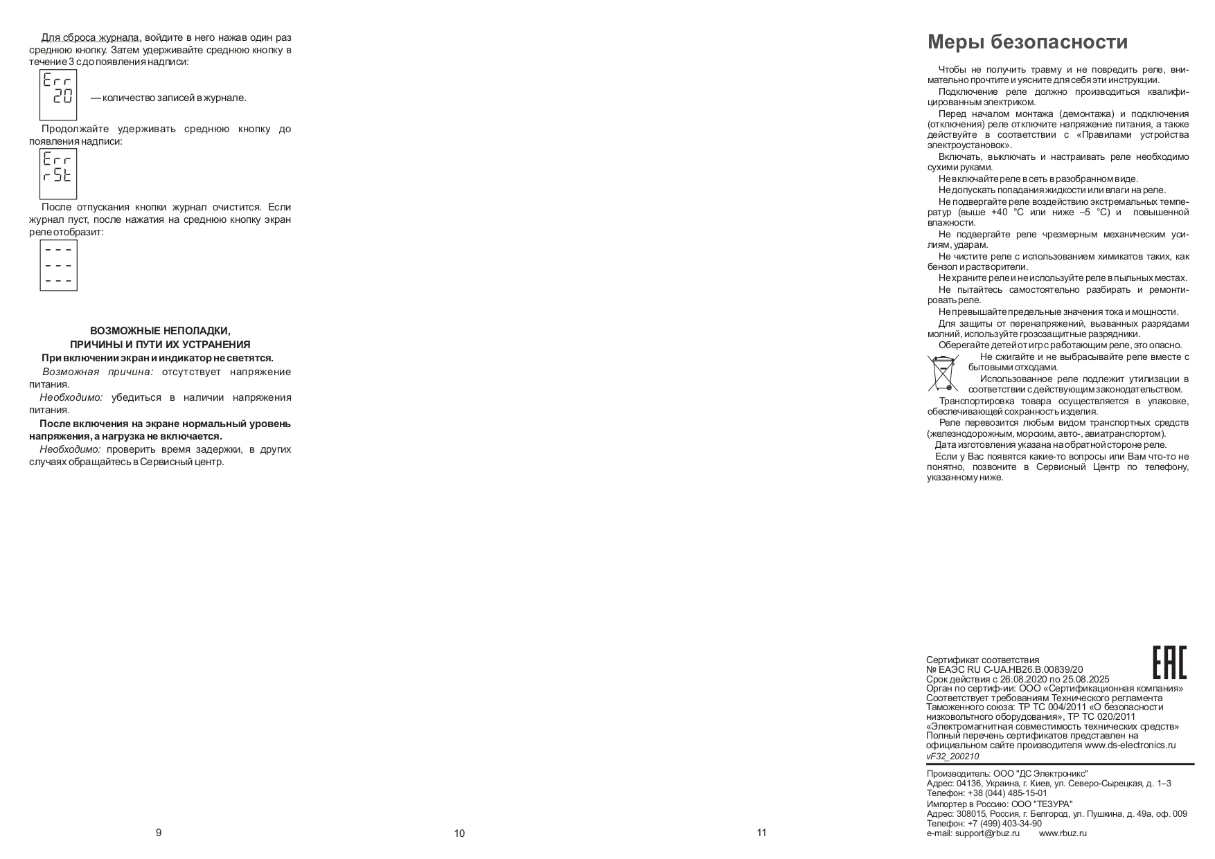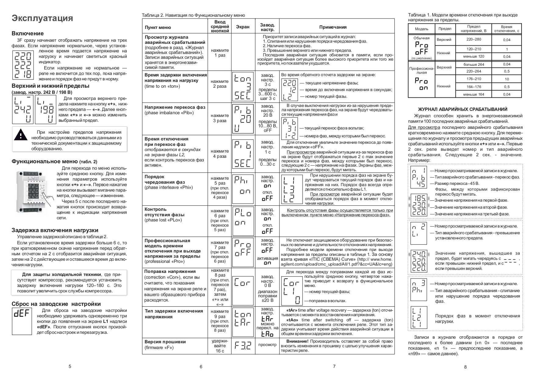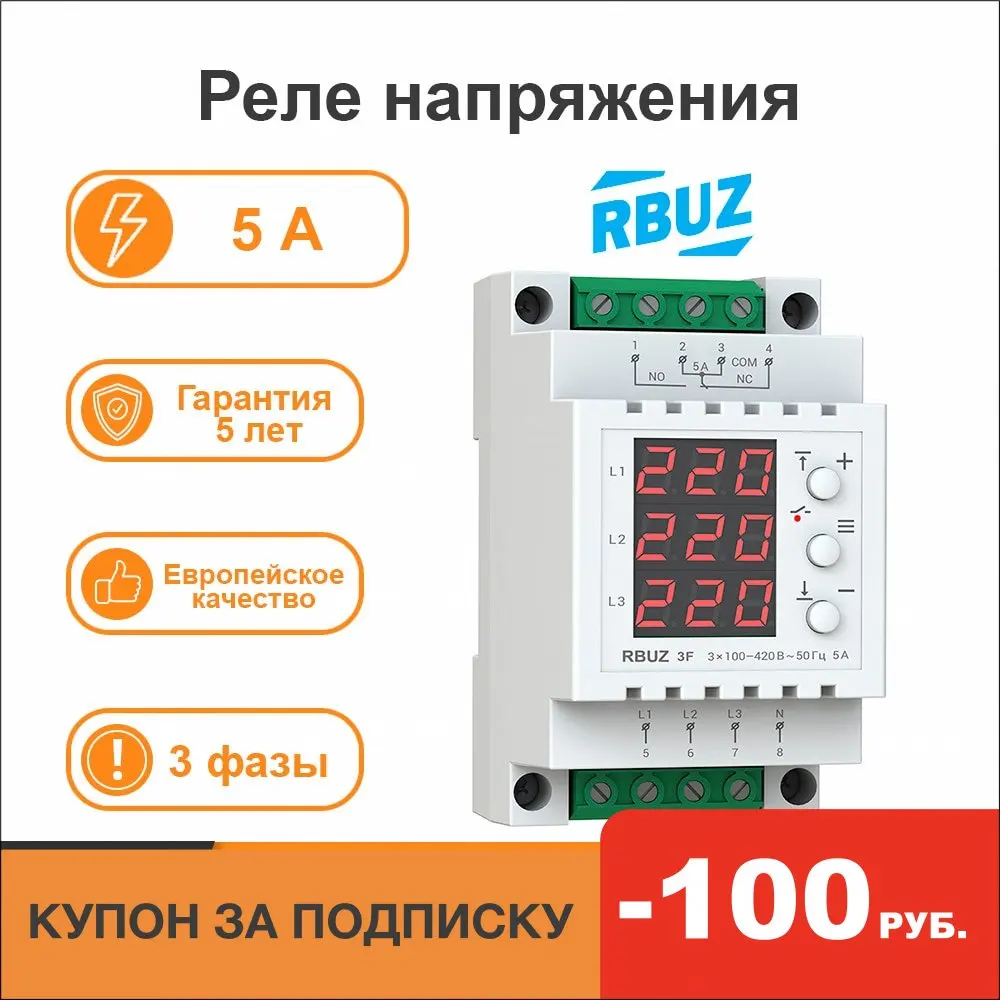 Эффективный контроль и отображениеВ меню вы можете отключить контроль порядка чередования, а также перекос фаз, по отдельности. Также возможно выключить контроль отсутствия фаз (доступно только при отключенном перекосе). В прежних версиях реле отсутствие фазы не считалось ошибкой для использования в однофазном режиме. Теперь им можно управлять.Запись аварийных ситуаций в энергонезависимой памяти осуществляется по их приоритету. Например, если в сети одновременно случится скачок напряжения и перекос фаз, то в память запишется более важное событие – перекос фаз.Задержка включенияПодача нагрузки осуществляется по окончанию задержки включения. Вы можете настраивать ее длительность от 3 до 600 с, в зависимости от типа подключенных устройств. По умолчанию установлена модель задержки, которая учитывает продолжительность аварийной ситуации, позволяя быстрее возобновить работу оборудования. Но вы можете активировать модель задержки, которая начинает отсчет лишь после окончания аварийной ситуации.Профессиональная модель выключенияАктивируйте профессиональную модель выключения нагрузки, которая поможет избежать частого отключения оборудования. Выключение нагрузки не будет происходить при безопасных за значением и длительностью отклонениях напряжения от нормы.Удобство в пользованииРеле начинает отображать на цифровом экране текущее напряжение каждой из фаз сразу после включения. Если напряжение находится в установленных пределах, устройство включит подачу нагрузки, о чем будет сигнализировать красный индикатор. Управление реле осуществляется всего тремя кнопками.Простой монтажРеле устанавливается в распределительный щиток на стандартную DIN-рейку шириной 35 мм. Если существует вероятность попадания воды на устройство или в помещении повышенный уровень влажности, тогда шкаф должен соответствовать классу защиты ІР55 по ГОСТ 14254.