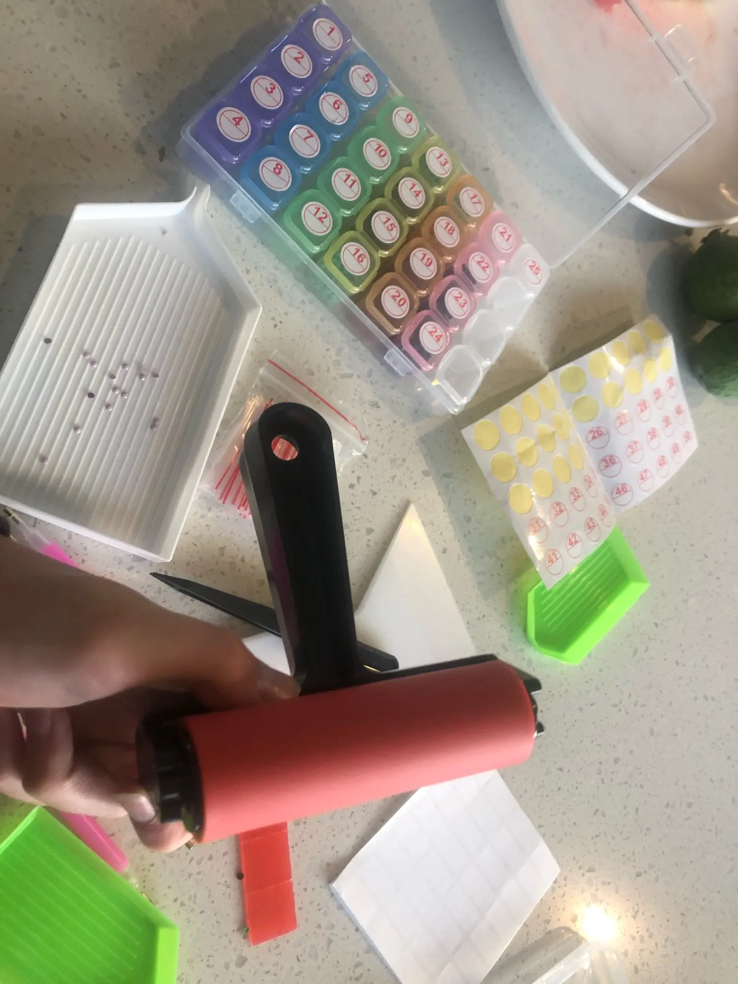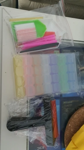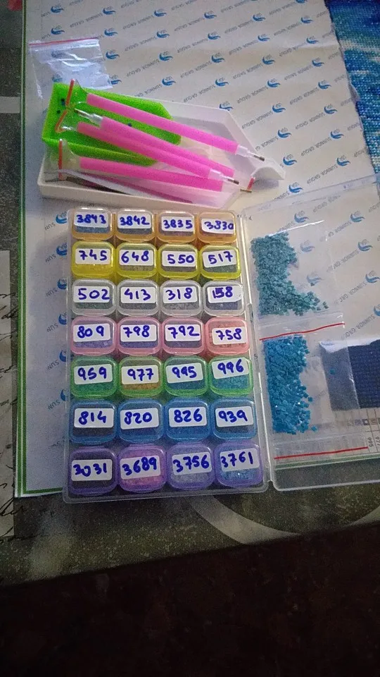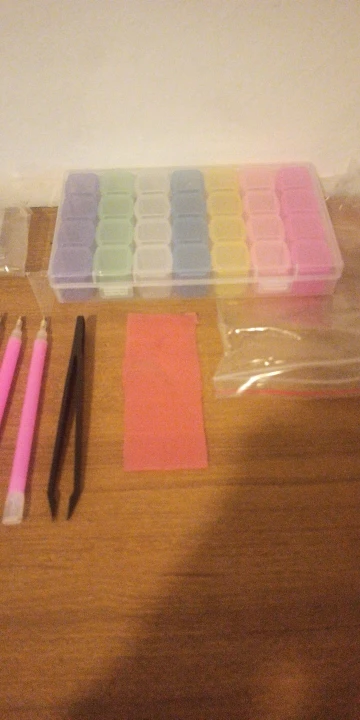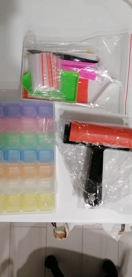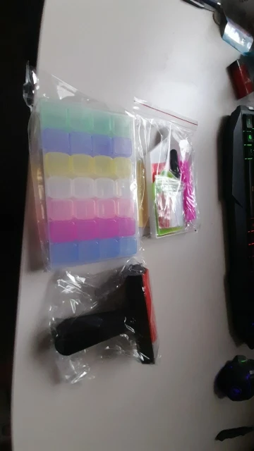 Отримала посилку 26.11, замовлення було 11.11. Все відповідає фотографіям: ролик для закріплення каменів, 4 ручки, у яких на одному кінці одинарна насадка, а на іншому для багатьох камінців (одна на 3 камінці, дві на 6 і одна на 10), три контейнери для камінців (один великий і два малих), бокс для зберігання каміння з 28 ячейками, 50 пронумерованих наліпок і 64 пусті, 10 квадратиків клею, 20 невеликих целофанових пакетів і пінцет. Ручками зручно брати і квадратне, і кругле каміння. Всім задоволена і буду замовляти ще!