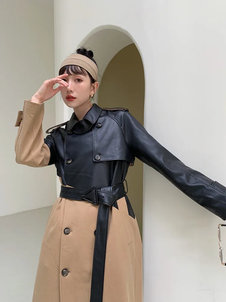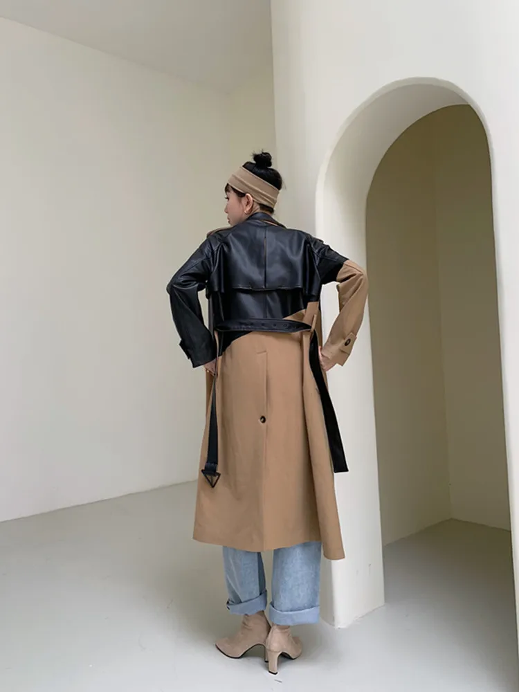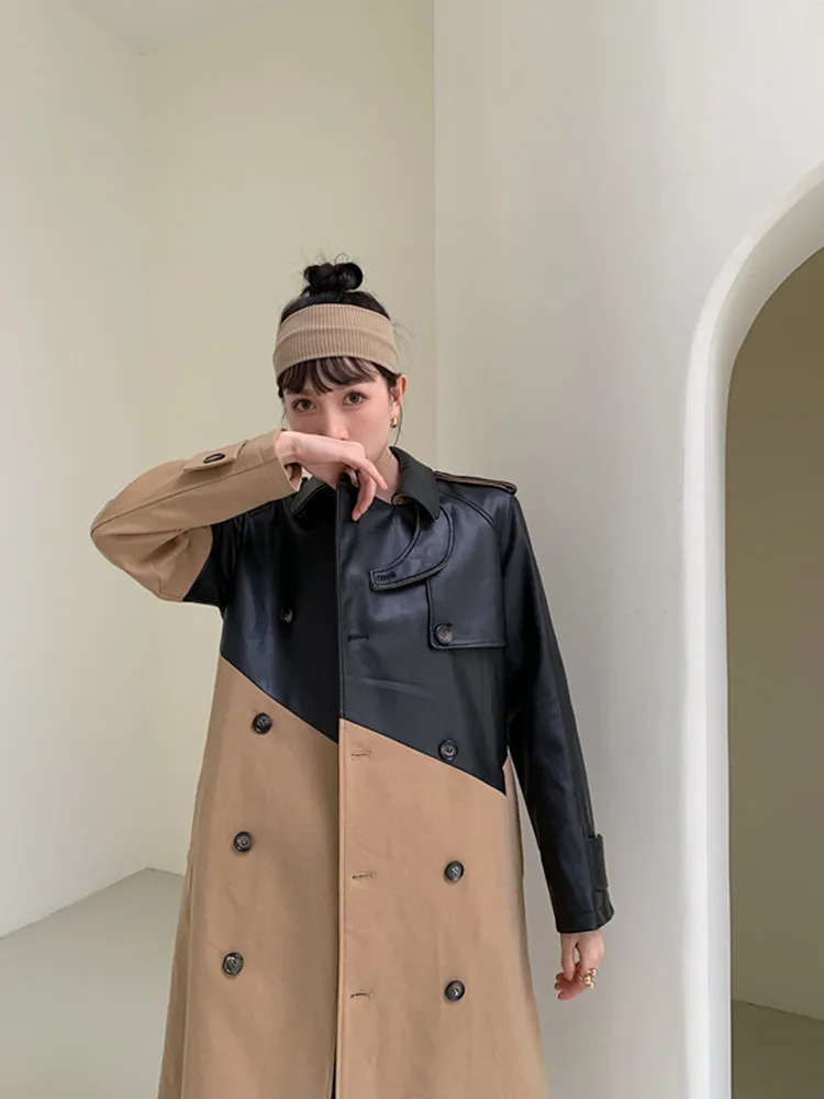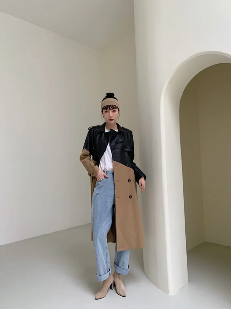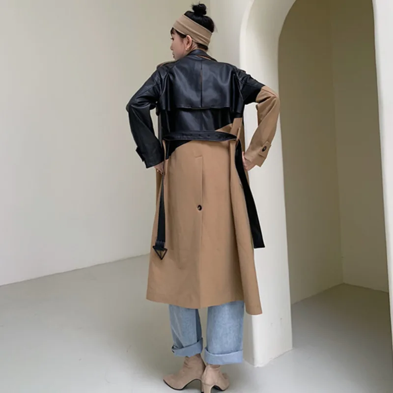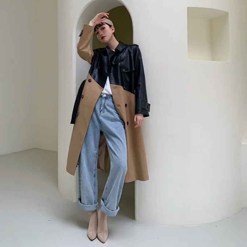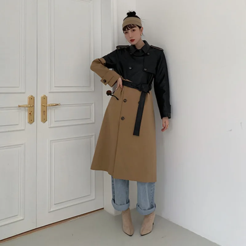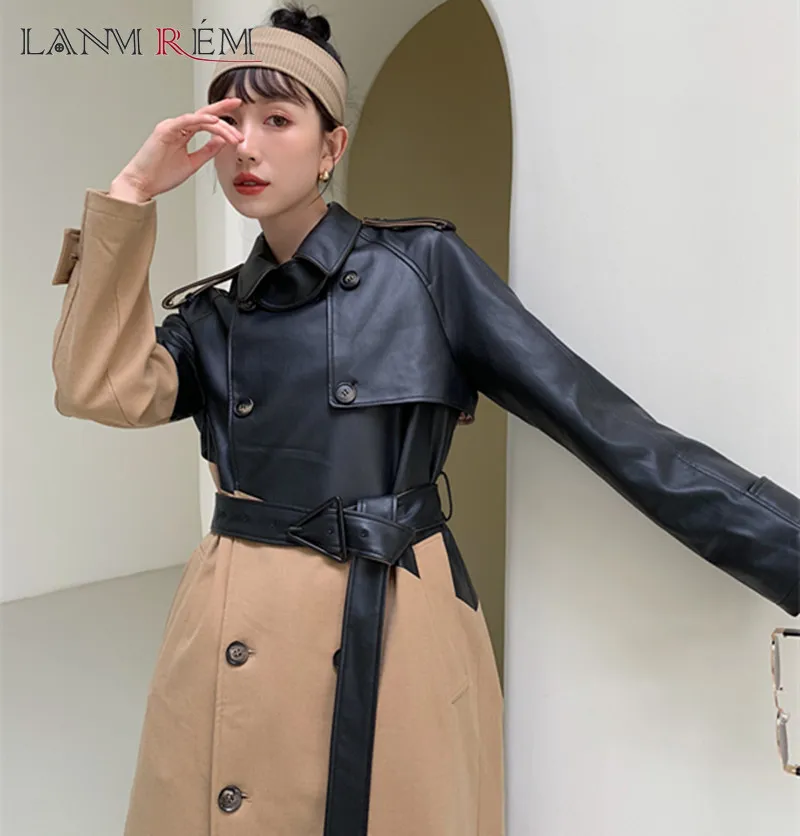 Пальто LANMREM женское из экокожи, двубортное длинное пальто контрастных цветов, черного и коричневого цвета с поясом, модная одежда на осень 2A1468