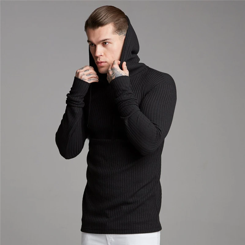 Брендовые черные свитера с капюшоном, мужские повседневные пуловеры, Осень-зима, модный тонкий свитер, однотонный облегающий вязаный свитер с длинным рукавом