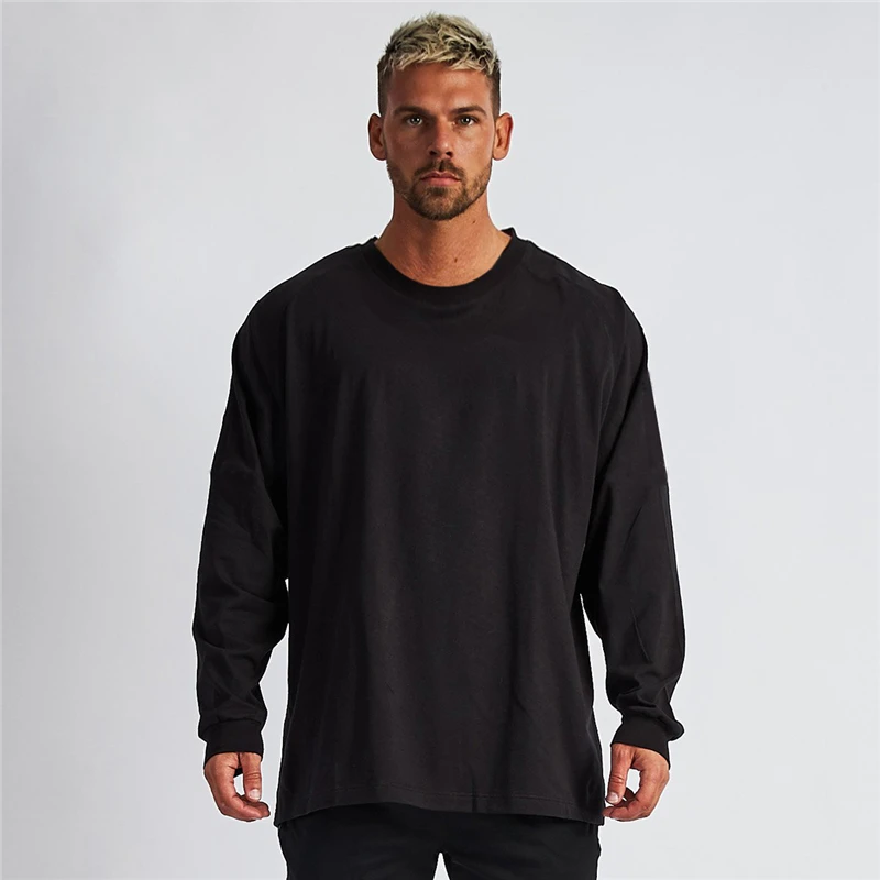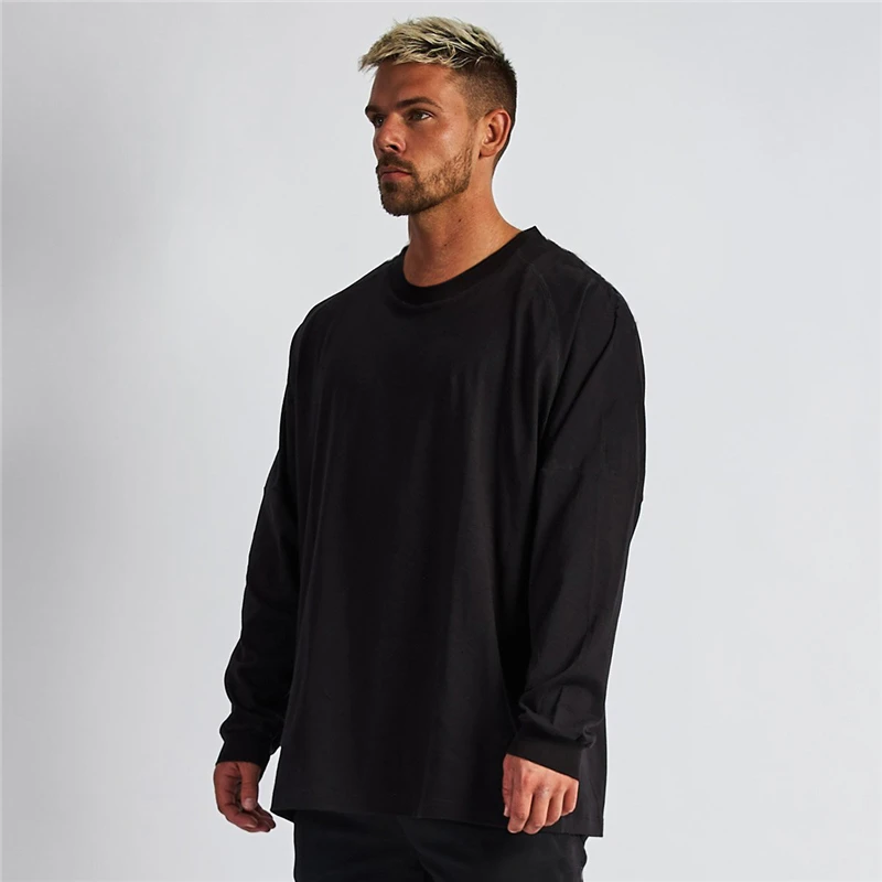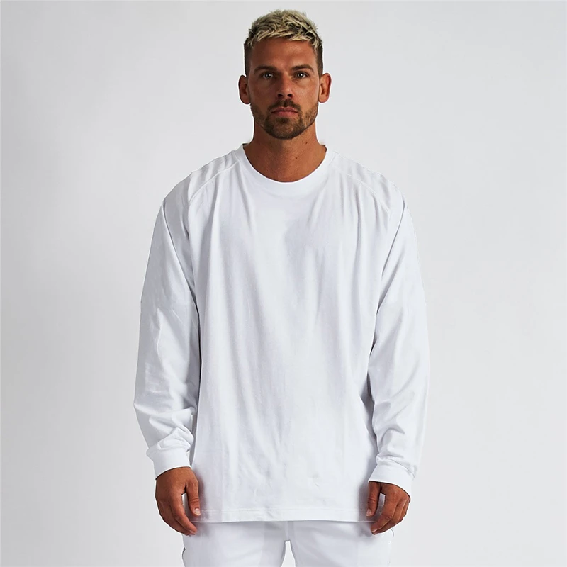 Мужская свободная футболка оверсайз с длинным рукавом и опущенным плечом, Ретро футболка для фитнеса, Осенние Топы для бодибилдинга