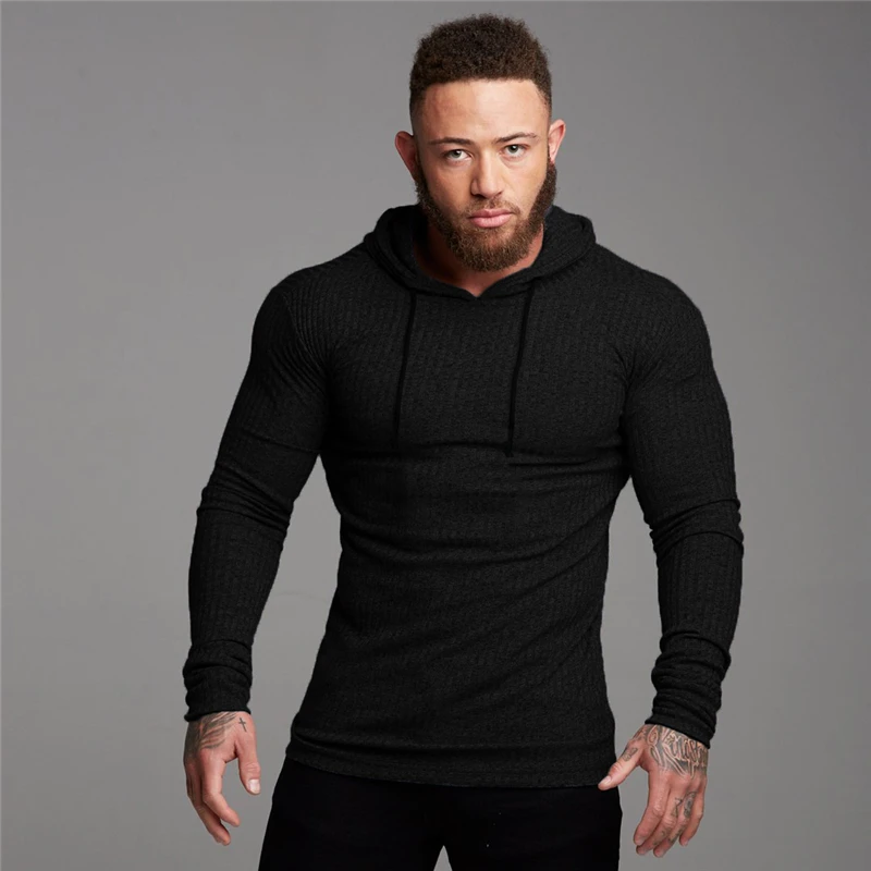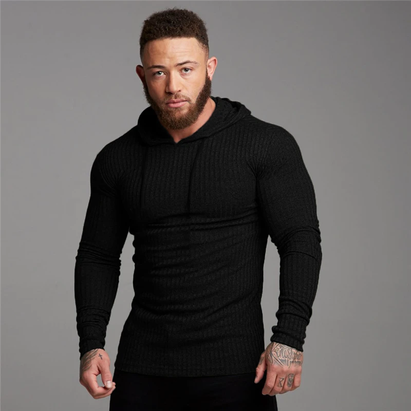 Новинка, осенняя модная мужская футболка с капюшоном, облегающие свитеры, Мужская трикотажная одежда с длинным рукавом, пуловеры, футболки, мужские свитеры для фитнеса