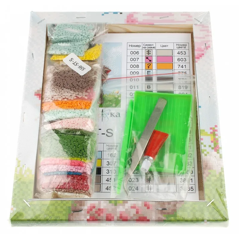 Основа работы – холст, на котором напечатана цветная схема с контрастными условными обозначениями, поверх нанесено клеевое покрытие и защищающая прозрачная плёнка. Используя прилагающийся металлический пинцет и комплект квадратных акриловых камней 2,5*2,5 мм, вы отлично справитесь с заполнением каждого участка картины. Постепенно заполняя ряды камешками, вы будете в восторге от высокой детализации изображения.