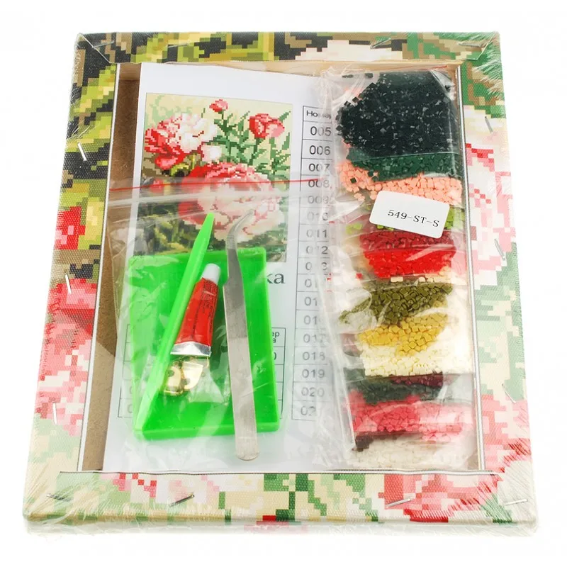 Основа работы – холст, на котором напечатана цветная схема с контрастными условными обозначениями, поверх нанесено клеевое покрытие и защищающая прозрачная плёнка. Используя прилагающийся металлический пинцет и комплект квадратных акриловых камней, вы отлично справитесь с заполнением каждого участка картины в формате 20*25 см.