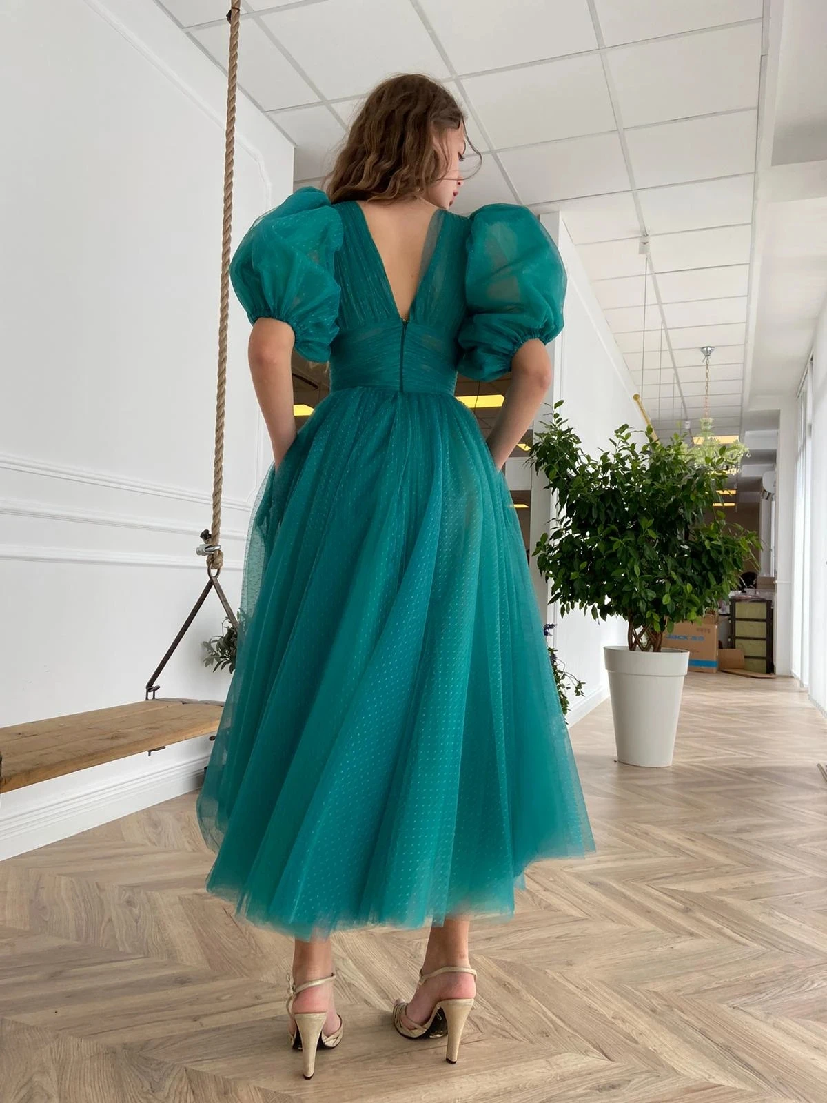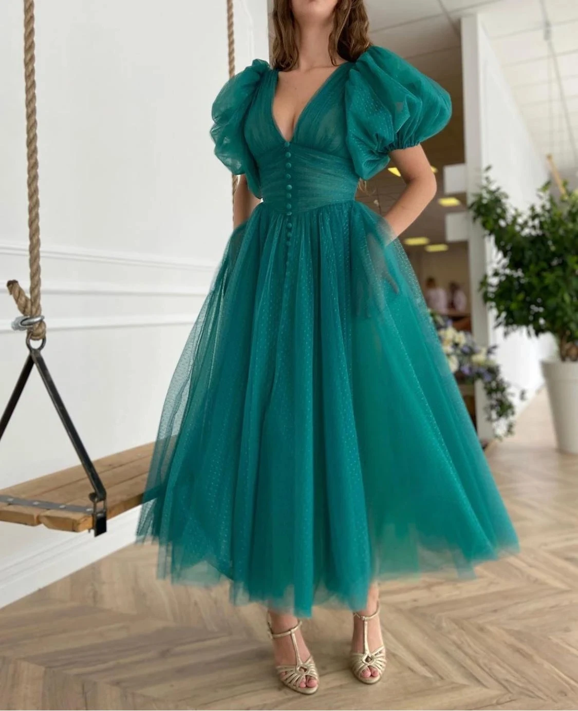 HONGFUYU чайные l Зеленые тюлевые коктейльные платья в горошек для выпускного вечера трапециевидные вечерние платья с пышными рукавами на пуговицах платье для вечеринки