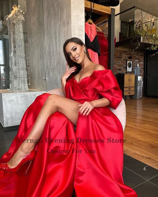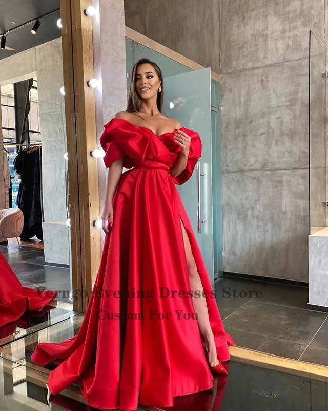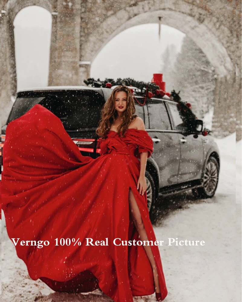 Женское длинное атласное вечернее платье Verngo, красное вечерние с рукавами, открытыми плечами, для выпускного вечера, с разрезом по бокам, 2020