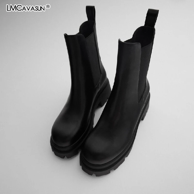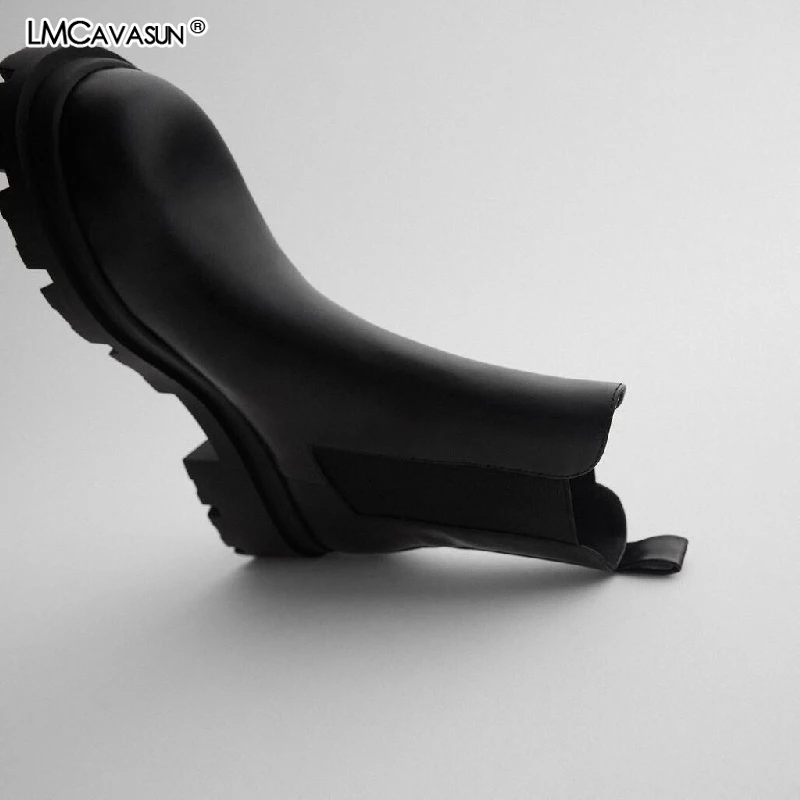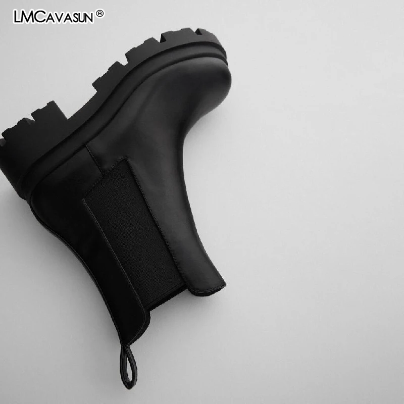 LMCAVASUN зимние кожаные женские ботильоны без шнуровки, женские ботинки на платформе со шнуровкой