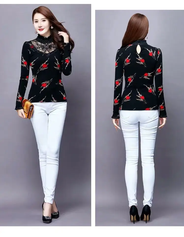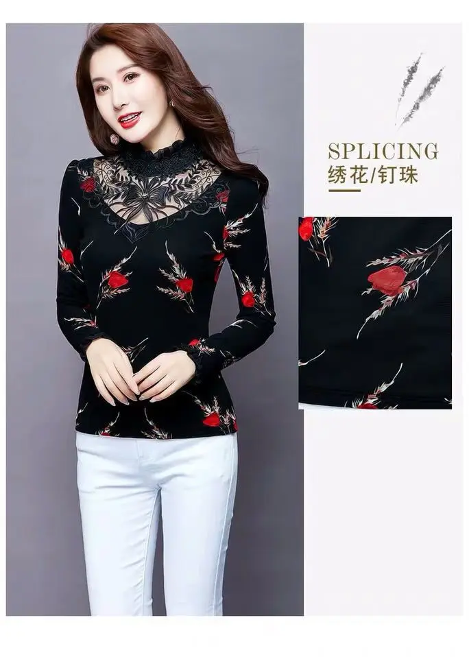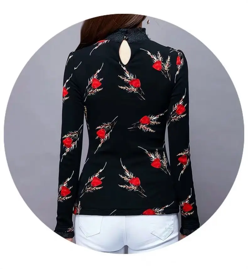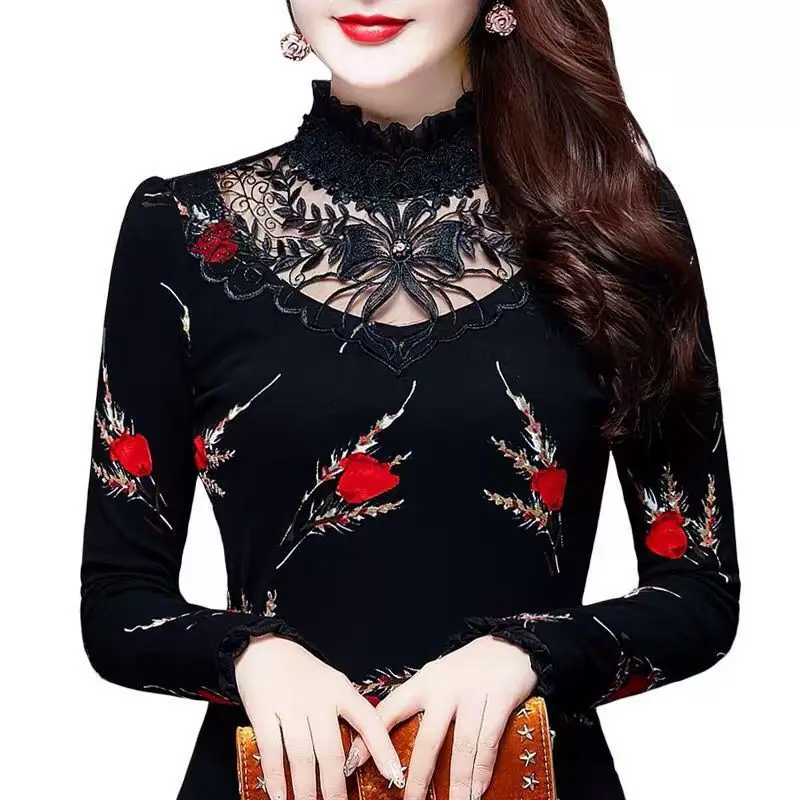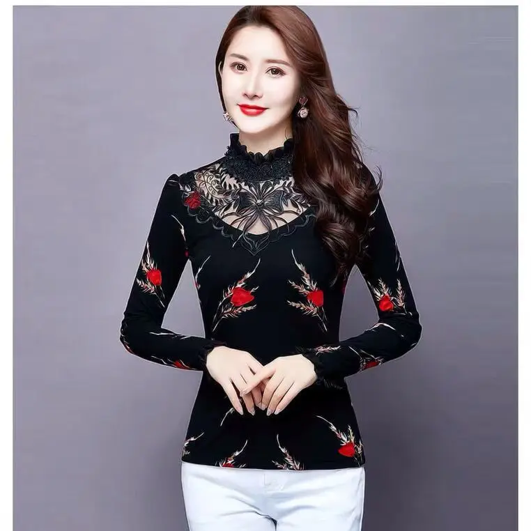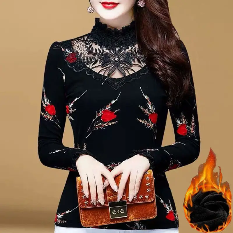 Осенне-зимние женские толстые кружевные флисовые топы с принтом, женская нижняя рубашка и блузка, женская черная блузка с вырезами, большие размеры 5XL
