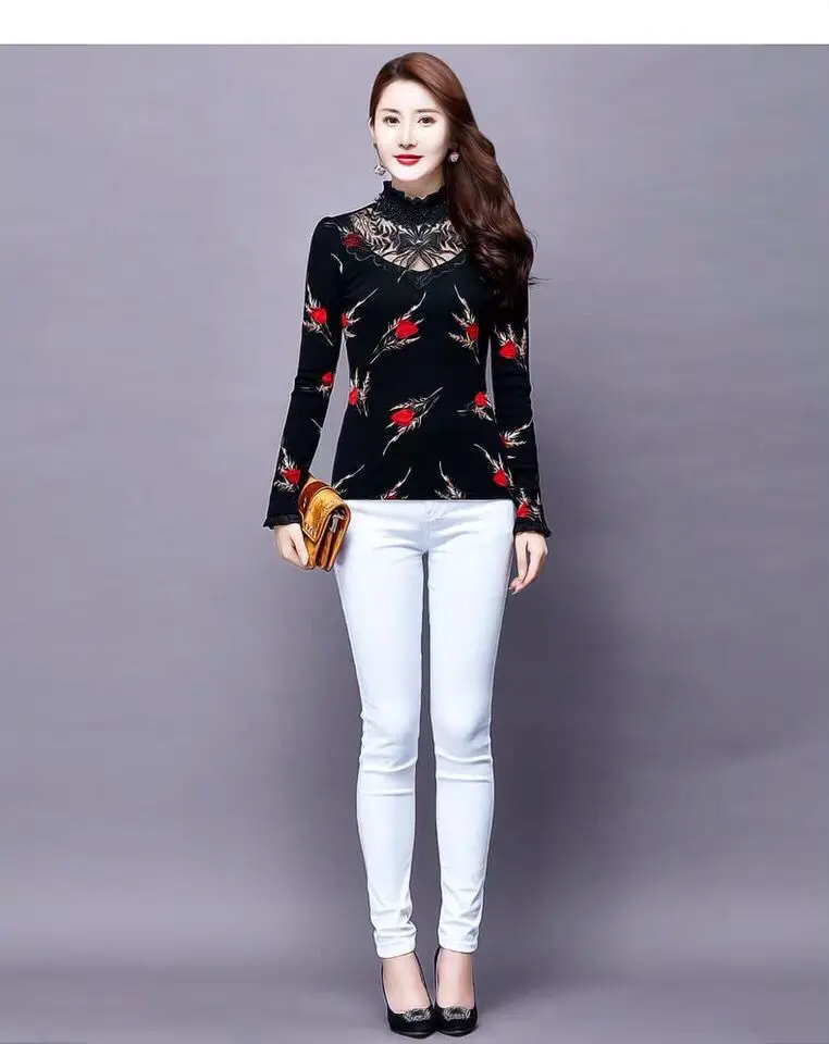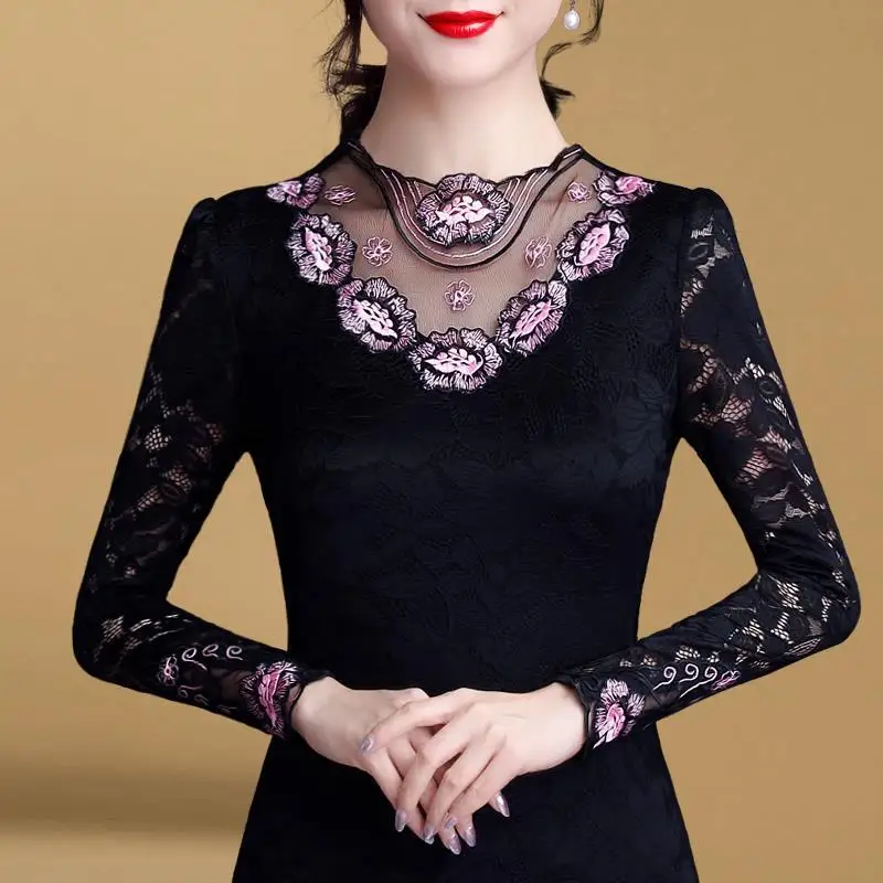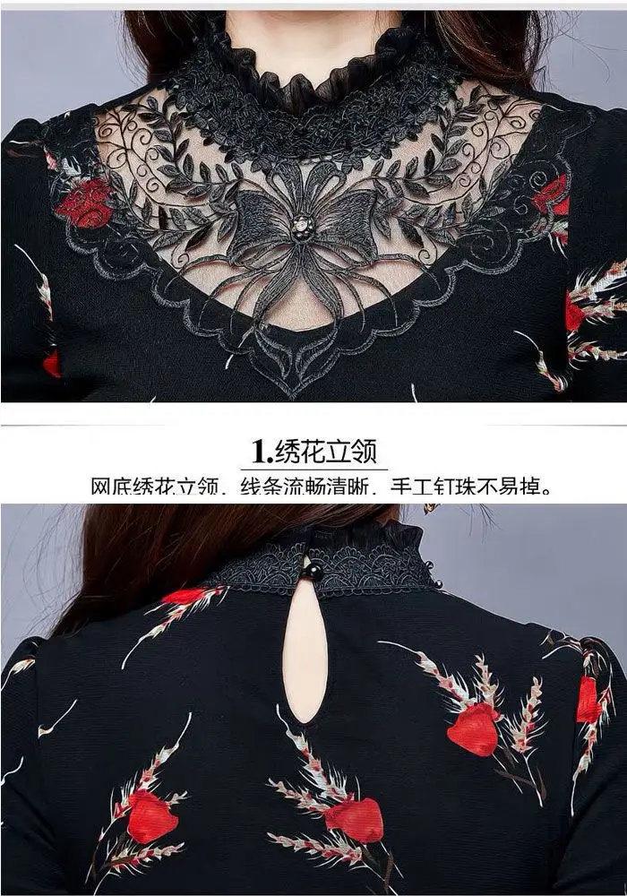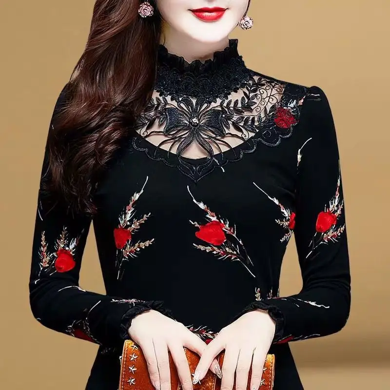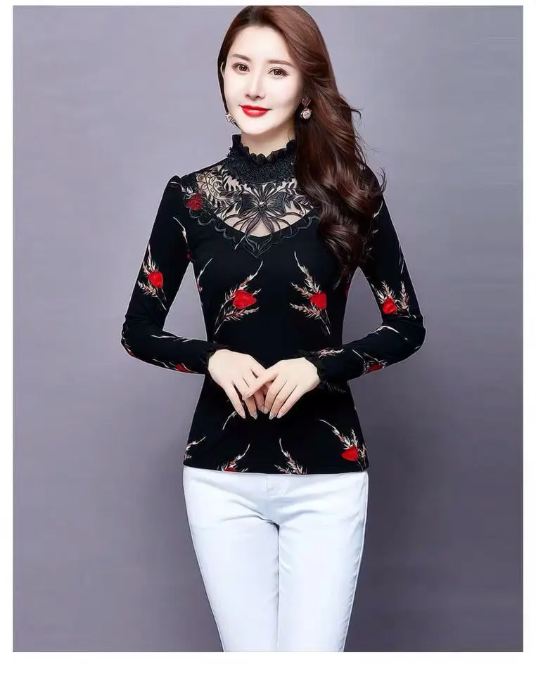 Осенне-зимние женские толстые кружевные флисовые топы с принтом, женская нижняя рубашка и блузка, женская черная блузка с вырезами, большие размеры 5XL