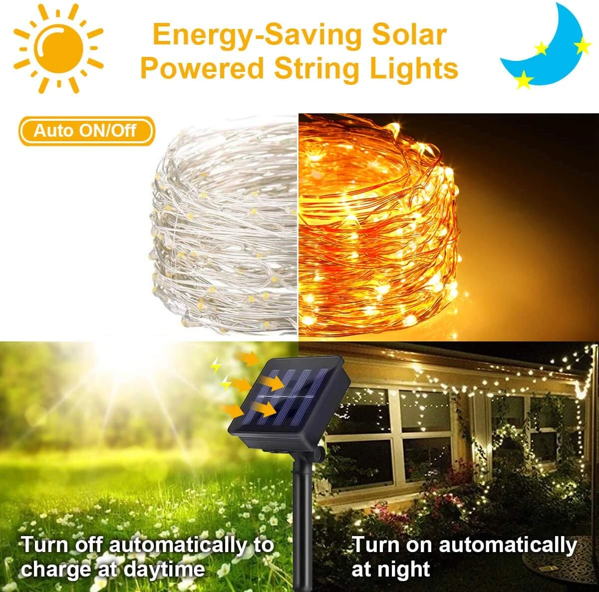 Солнечный светильник: 100/200 светодиодный супер яркий светодиодный лампы, высокого качества медный провод. Солнечная энергия, без дополнительной зарядки, без замены батареи. Автоматическое включение/выключение, светильник-датчик контролирует солнечный светильник, чтобы автоматически включаться в темноте и Автоматически выключаться в течение дня. Он может работать до 10 часов после полной зарядки.