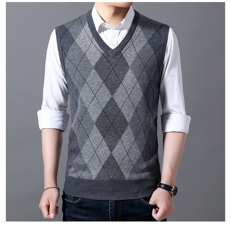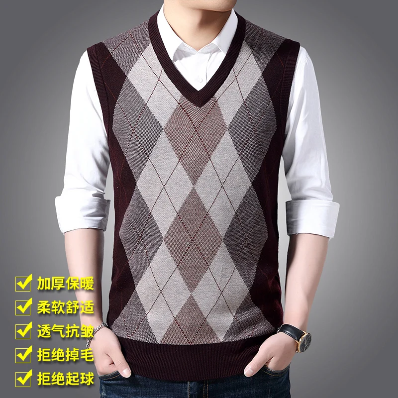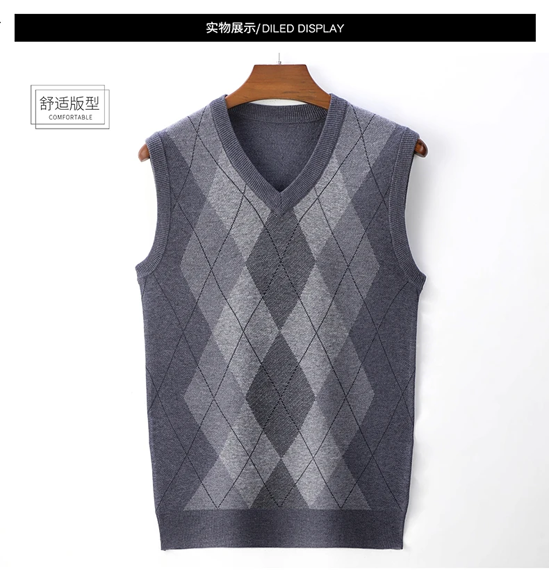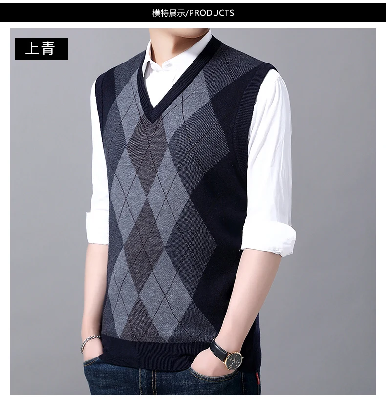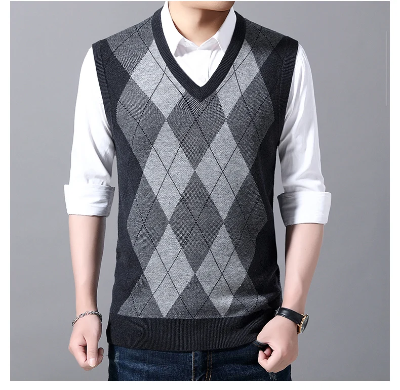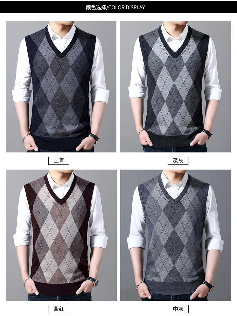 Мужской утепленный шерстяной свитер, модный клетчатый теплый кашемировый жилет, мужской джемпер без рукавов с узором ромбиками, пуловеры