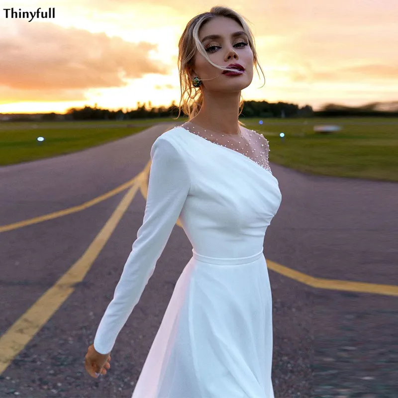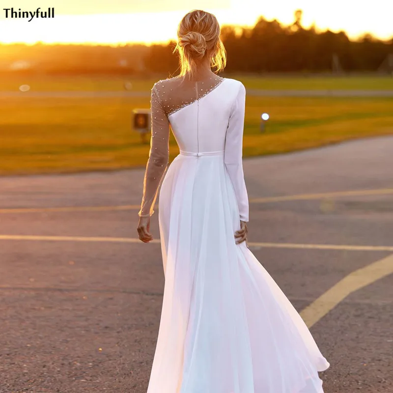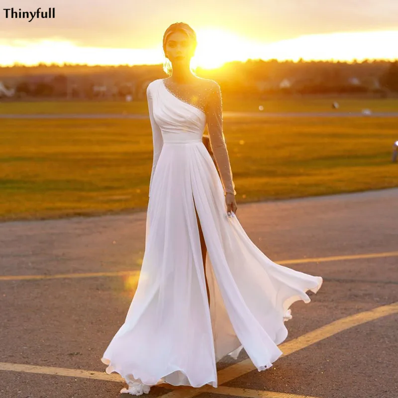 Женское свадебное платье в стиле бохо Thinyfull, Пляжное платье с длинными рукавами, жемчужными бусинами и разрезом сбоку, Платье трапециевидного силуэта