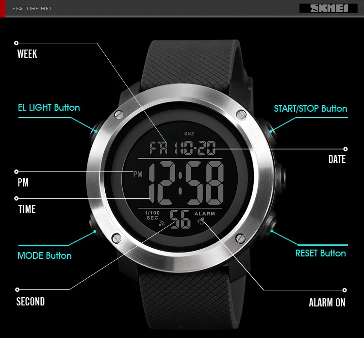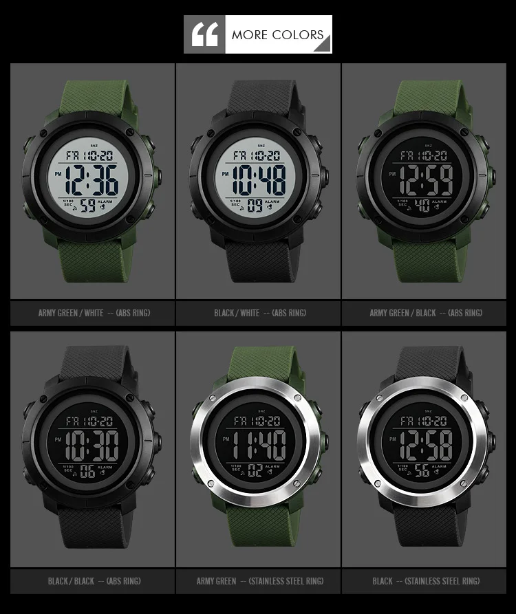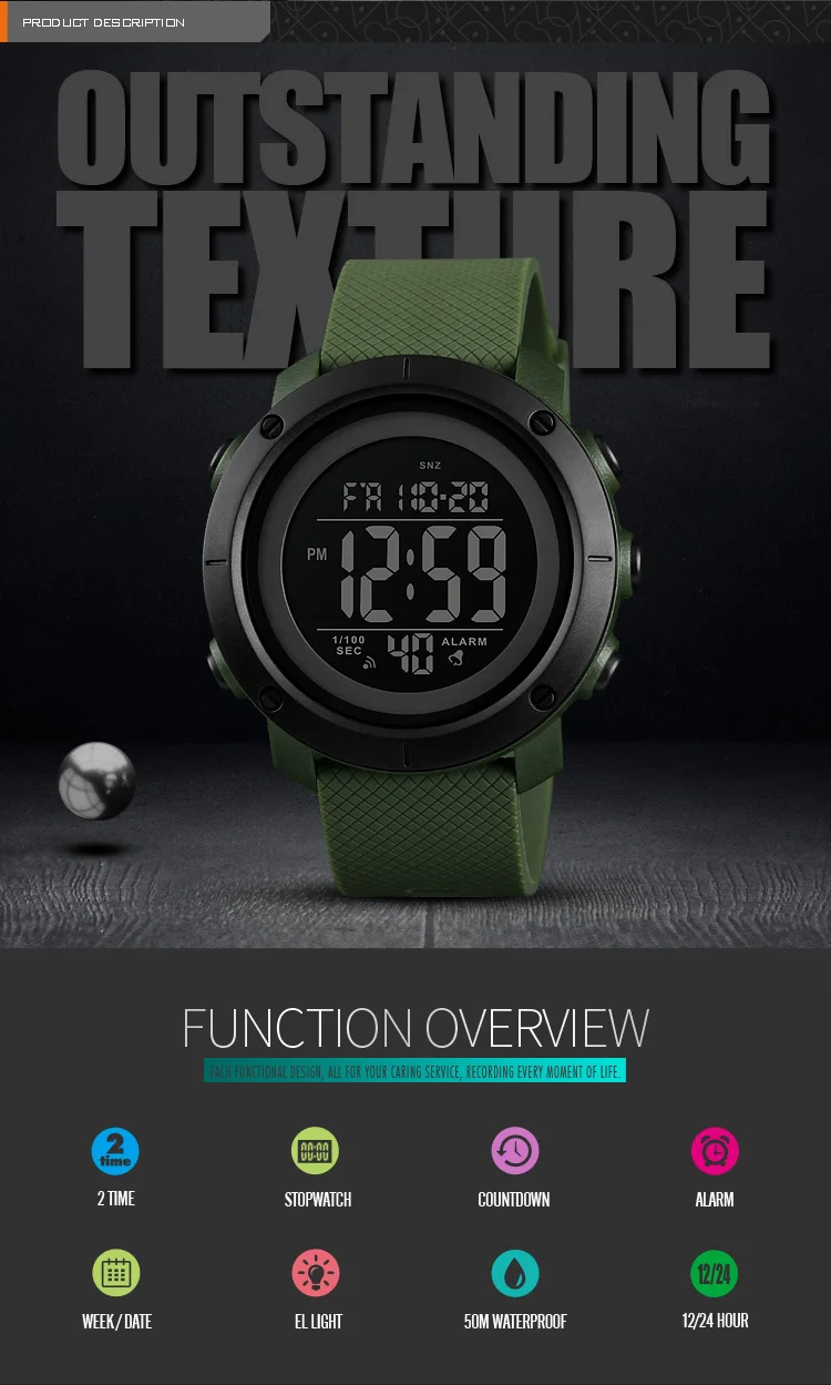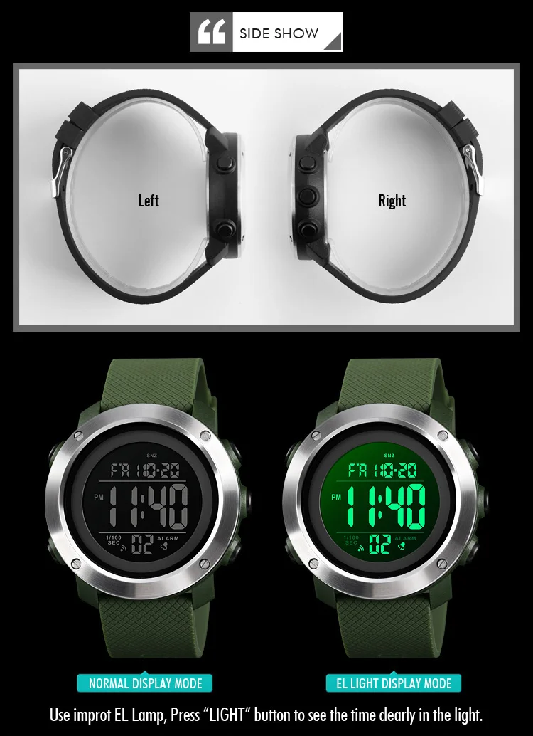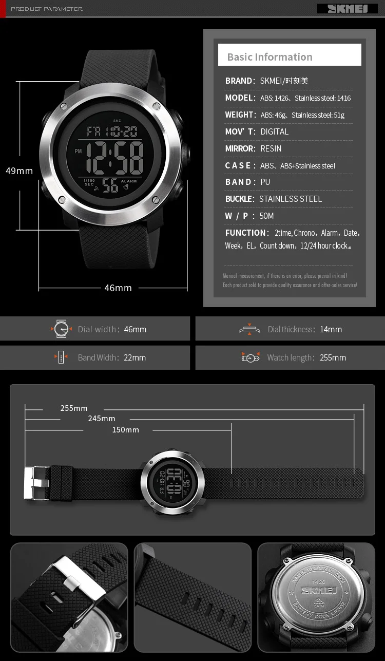 ▪Тип изделия: цифровые наручные часы ▪Механизм: цифровой механизм ▪Пол: влюбленных, мужчин, женщин и мужчин ▪Стиль: спортивная модная повседневная одежда ▪Чехол Форма: круглый ▪Материал циферблата: смола ▪Материал корпуса: АБС-пластик или нержавеющая сталь ▪Материал ремешка: полиуретан ▪Тип застежки: Пряжка ▪Диаметр циферблата: 46 мм ▪Чехол Толщина: 14 мм ▪Длина ремешка: 255 мм ▪Ширина ремешка: 22 мм ▪Вес: около 51 г ▪Характеристики: водонепроницаемость 50 м, шок Устойчивый, полный календарь, хронограф, Дисплей недели, светодиодный дисплей, двойной Время, обратный отсчет.