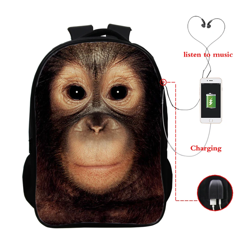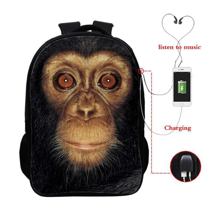 Забавная обезьянка с принтом лица, 3d школьные сумки для подростков, девочек, мальчиков, рюкзак, сумка для женщин и мужчин, сумки для книг, зарядка через Usb, школьный рюкзак, Mochila