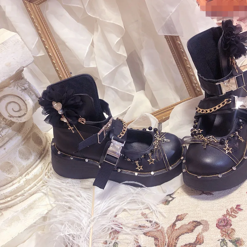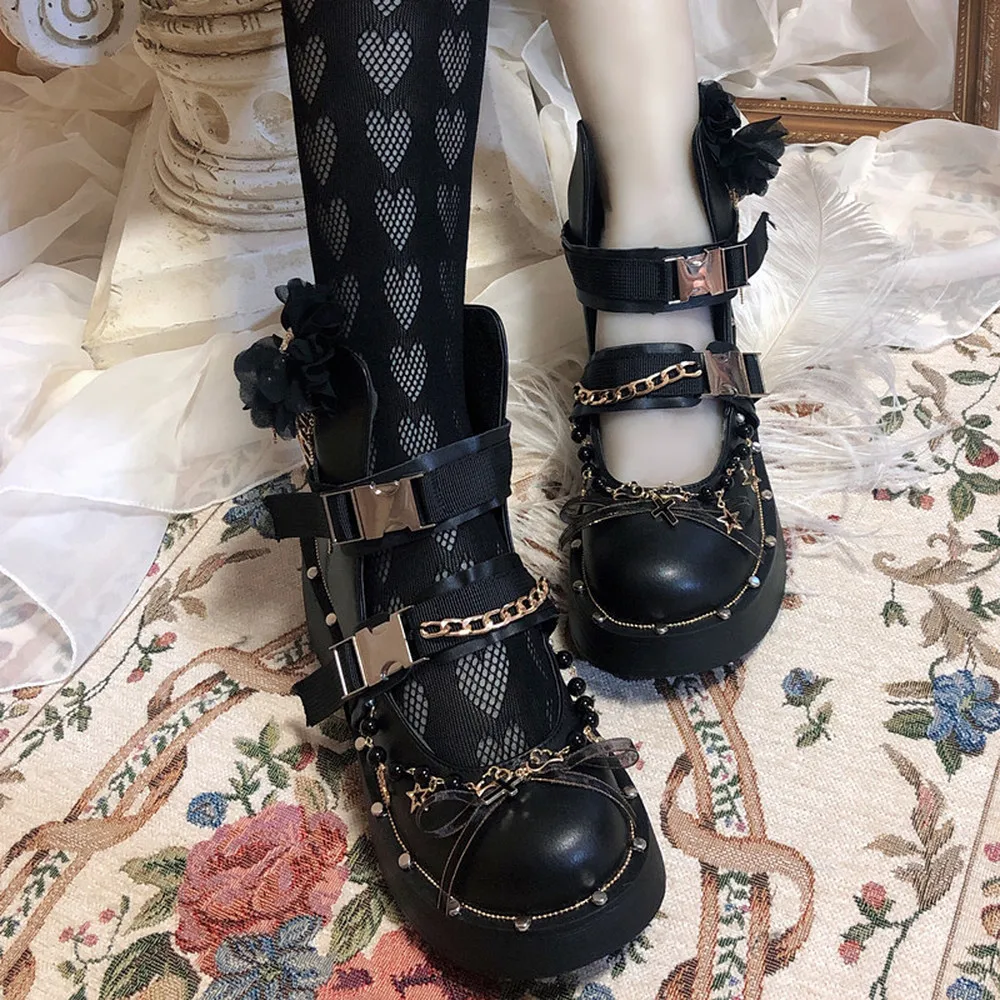 Женские ботильоны с круглым носком, на платформе, с вырезами, на массивном каблуке, с металлической цепочкой и пряжкой, готические панковские туфли, для косплея сделай сам