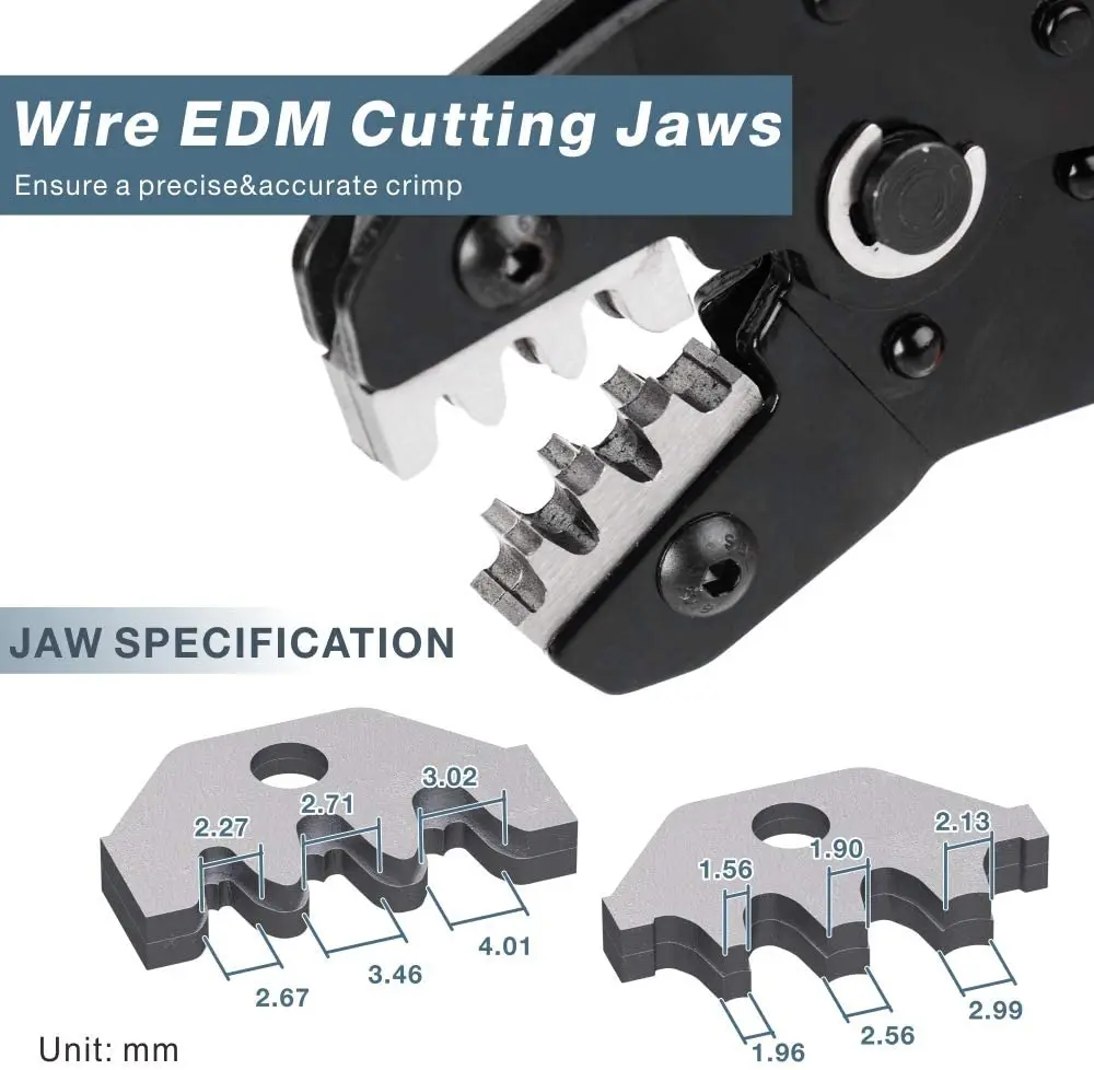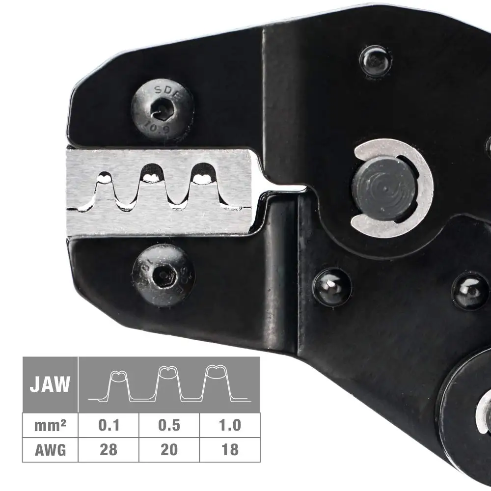 Диапазон обжима: 0,1-1,0 мм AWG 28-18Компоненты храпового обжима изготовлены из специальной стали.Проволока электрический разряд механической обработки режущие челюсти с идеальной полировкойТочные обжимные наборы и интегральный замок с самовыпускающимся механизмом обеспечивают высококачественный эффект обжима после многократного обжимаПодходит для Dupont,Molex CP терминалы, Molex C-Grid III 90119 серии, TE SUPERSEAL серии 1,0