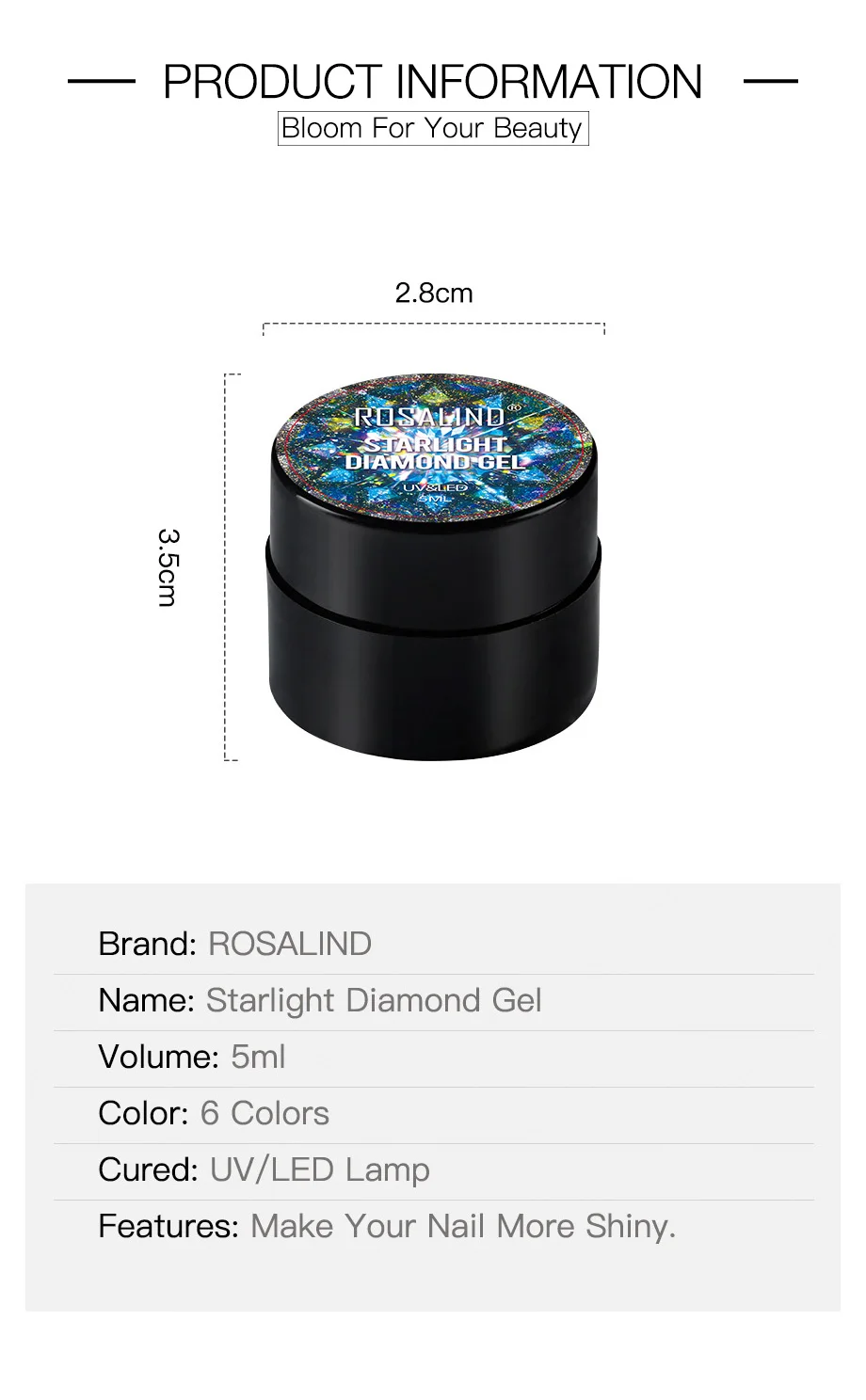 ROSALIND 5 мл звездный свет Алмазный гель Яркий для дизайна ногтей светодиодный/УФ-лампаХарактеристики Товара:Название бренда: ROSALINDНазвание: Блестящий Алмазный гельОбъем: 5 млЦвет: 6 цветовИзлеченная: УФ/Светодиодная лампаМы уверены, что наш Гель-лак лучшего качества на Aliexpress.-Качество-наш первый приоритет.-Светильник, почти без запаха (только верхнее покрытие и основа имеют умеренный запах), мы применяем только органическую текстуру для защиты вашего здоровья.-Цвет будет сиять до 30 дней.-Цвета на выбор, подходят для всех случаев.Шаг за шагом:-1. Форма ногтя. Слегка смочите поверхность ногтевой пластины. Дезинфицировать.-2. Нанесите базовый слой основы от кутикулы до свободного края (не забудьте запечатать край ногтя). Высушите ногти под светодиодный светильник в течение 10 секунд или УФ-светильник в течение 2 минут.-3. Нанесите тонкое пальто отмачиваемого геля на выбор. Свободный край крышки. Лечение: 30 секунд в светодиодный светильник, или 2 минуты в УФ-лампе.-4. Повторите 2-е тонкое покрытие отмачиваемого гель-лака на ногти. Высушите под светодиодный лампой в течение 30 секунд или УФ-светильник в течение 2 минут.-5. Нанесите верхнее пальто. Свободный край крышки. Лечение: 30 секунд в светодиодный светильник.-6. Удалите липкий остаток на ногтях с помощью очищающего средства. Затем нанесите питающее масло кутикулы для увлажнения влаги в кутикулу и кожу вокруг ногтя.Для удаления:-1. Отмачивайте ногти в акриловом удалителе в течение 5 минут.-2. Аккуратно Наденьте на каждый ноготь всю эмаль для ногтей.Внимание:1. Объем составляет 5 мл. Поскольку емкость бутылки составляет более 5 мл, гель для ногтей не будет полностью заполнен бутылкой!2. Плотно закрываются. Держите подальше от солнечного света. Хранить в недоступном для детей месте.