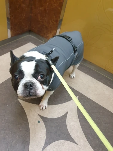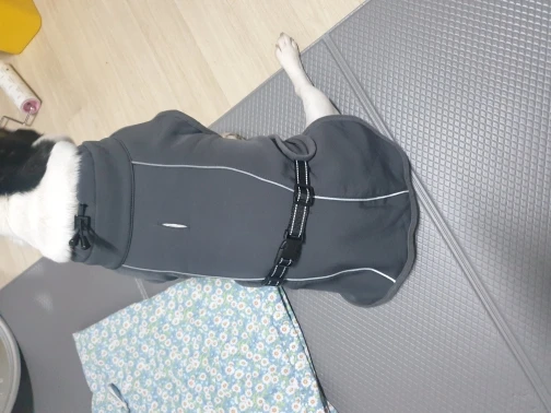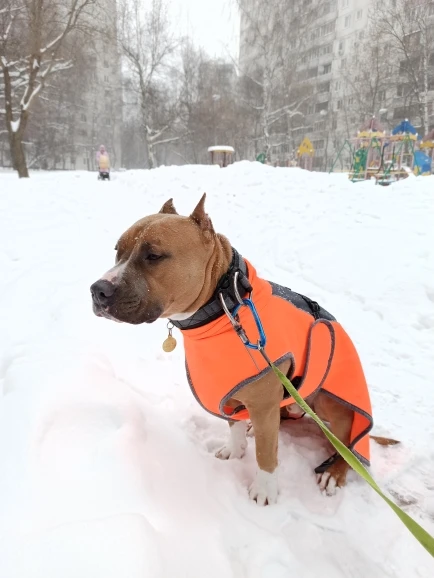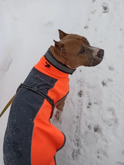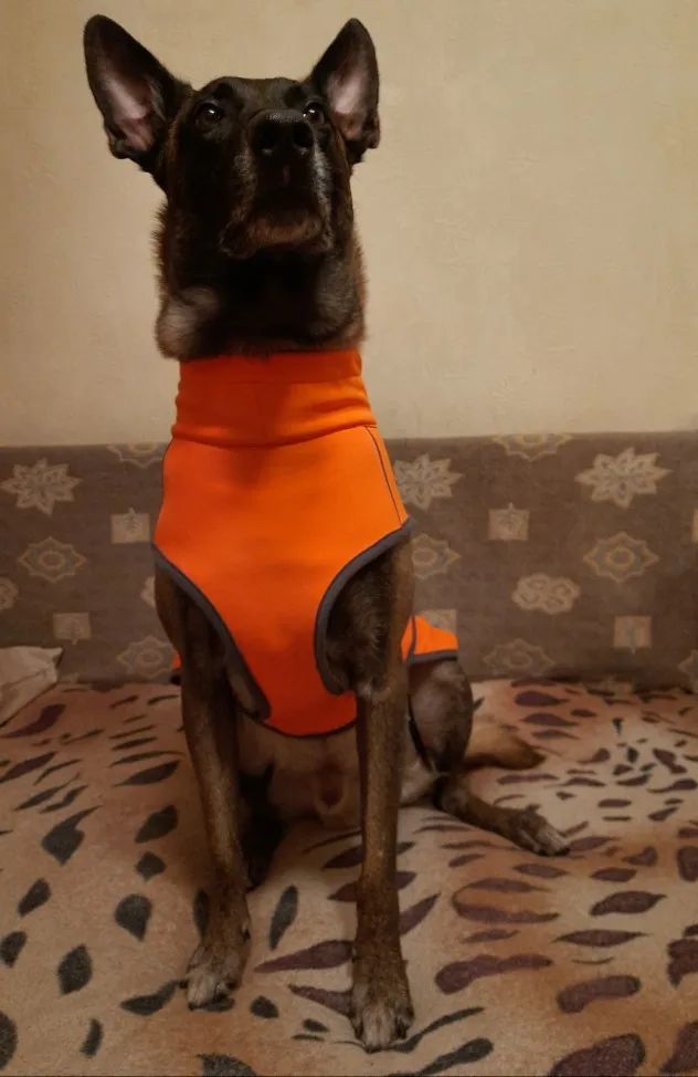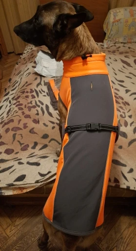Штука классная, теплая, качественно сшита. Правда моя собака немного велосипед, и если длина по спине легла как влитая, то в грудаке немного большемерит. Но есть запасная липучка под передние лапы, поэтому ничего не спадает.
