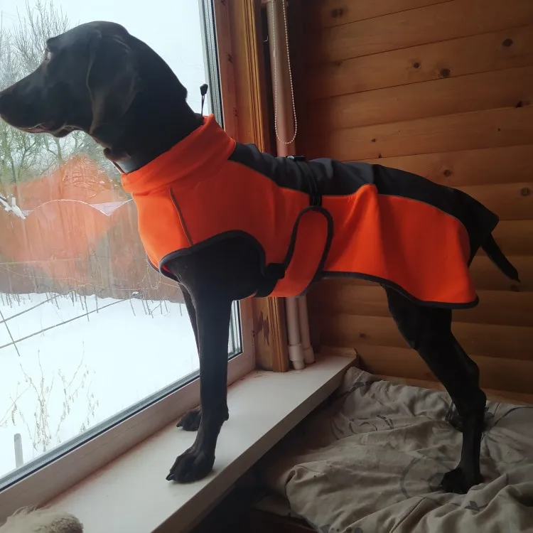 Доставка 3 недели, курцхаар, девочка 30кг, немного великоват,но ничего страшного,попа и бока закрыты) материал тонковат, только для теплой,зимы- внутри флис,сверху тонкая ткань,не думаю,что водонепроницаема. сшито качественно.