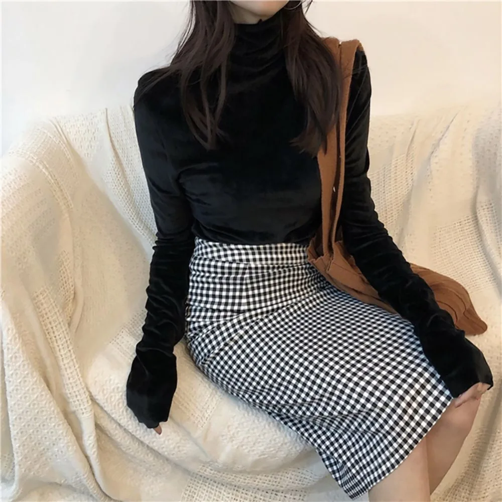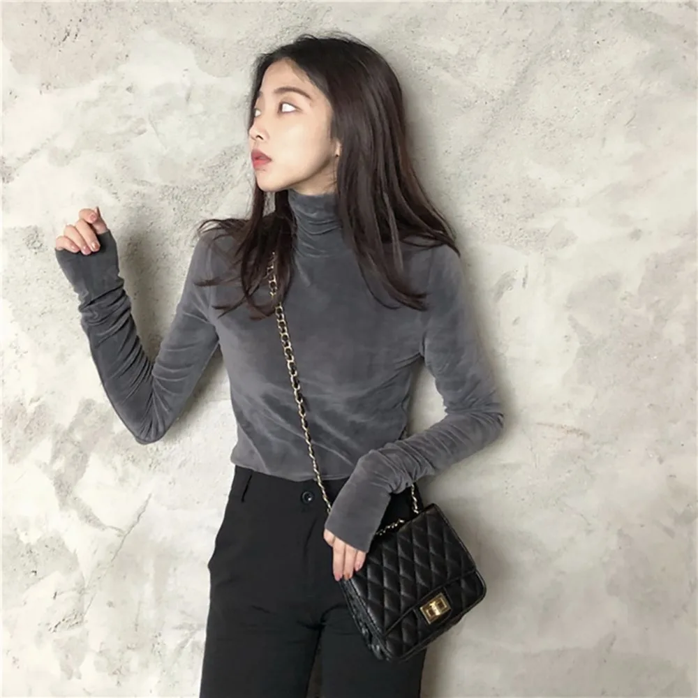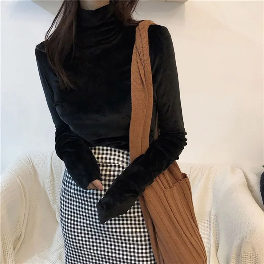Женская Мягкая флисовая водолазка, однотонная бархатная футболка с длинным рукавом, Осенний винтажный Топ для фитнеса, женская одежда