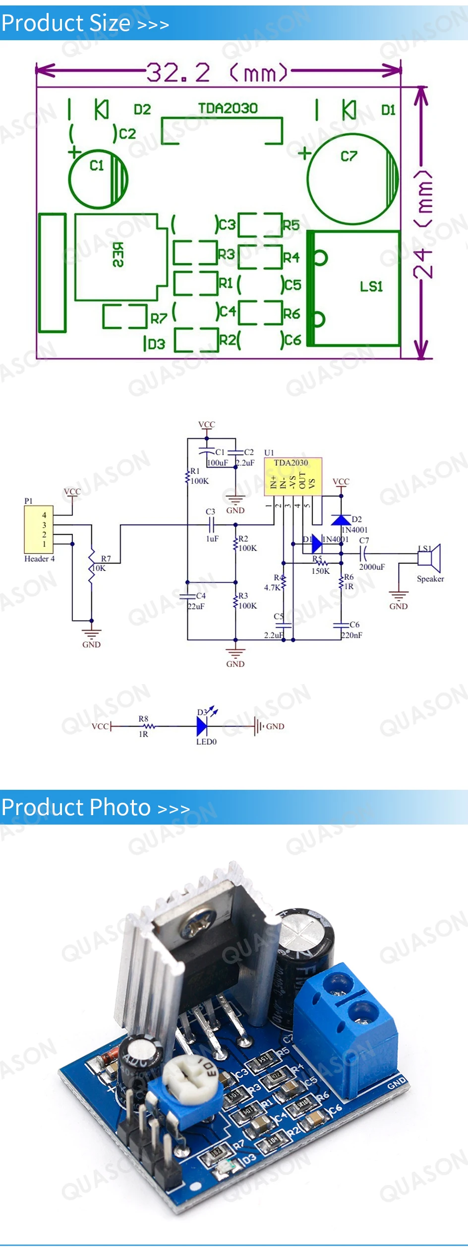 Модуль питания TDA2030, модуль платы усилителя звука TDA2030A, 6-12 В, одиночный