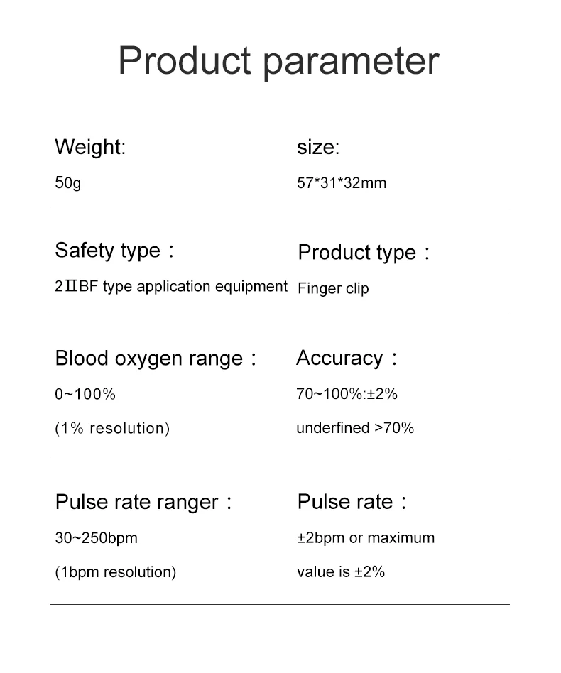 ИнструкцииПульсоксиметр CMS50M-это портативное оборудование, применяющее передовые технологии, в основном проверяет значение SpO2 и PR через палец, что обеспечивает передовые, неинвазивные и научные средства для количественного измерения насыщения кислородом.Пульсоксиметр CMS50M применим для использования в плато, общественном медицинском обслуживании, кислородном баре, фитнес-клубах, физкультурном зале, семейном и медицинском институте и т. д.2. Особенности1) может точно измерять SpO2 и частоту пульса2) SpO2 и дисплей частоты пульса, отображение гистограммы3) Низкая индикация напряжения батареи4) выключить автоматически, когда нет сигнала3. ПроизводительностьДиапазон измерения SpO2: 0% ~ 100%Точность: 70% ~ 100%: ± 2%0% ~ 69%: Не указаноДиапазон измерения PR: 30bpm ~ 250bpmТочность: ± 2bpm или ± 2%, в зависимости от того, что больше.Разрешение:SpO2: 1%PR: 1bpmХарактеристики измерения при слабом заполнении: SpO2 и Частота пульса могут быть показаны правильно, когда коэффициент заполнения пульса составляет 0.4%. Ошибка SpO2 ± 4%, погрешность пульса ± 2 bpm или ± 2%, в зависимости от того, что больше.Сопротивление окружающему светильник: отклонение между значением, измеренным в состоянииСветильник, сделанный человеком, или внутренний естественный светильник, и темная комната составляет менее ± 1%.Рабочий ток: ≤ 25 мАИсточник питания: две батарейки типа «AAA»Классификация безопасности: Тип BF4. Физические характеристикиРазмеры: 57 мм (Д) × 34 мм (Ш) × 31 мм (В)Вес: около 50 гАксессуарыПодвесная веревкаРуководство пользователяЧерный удар