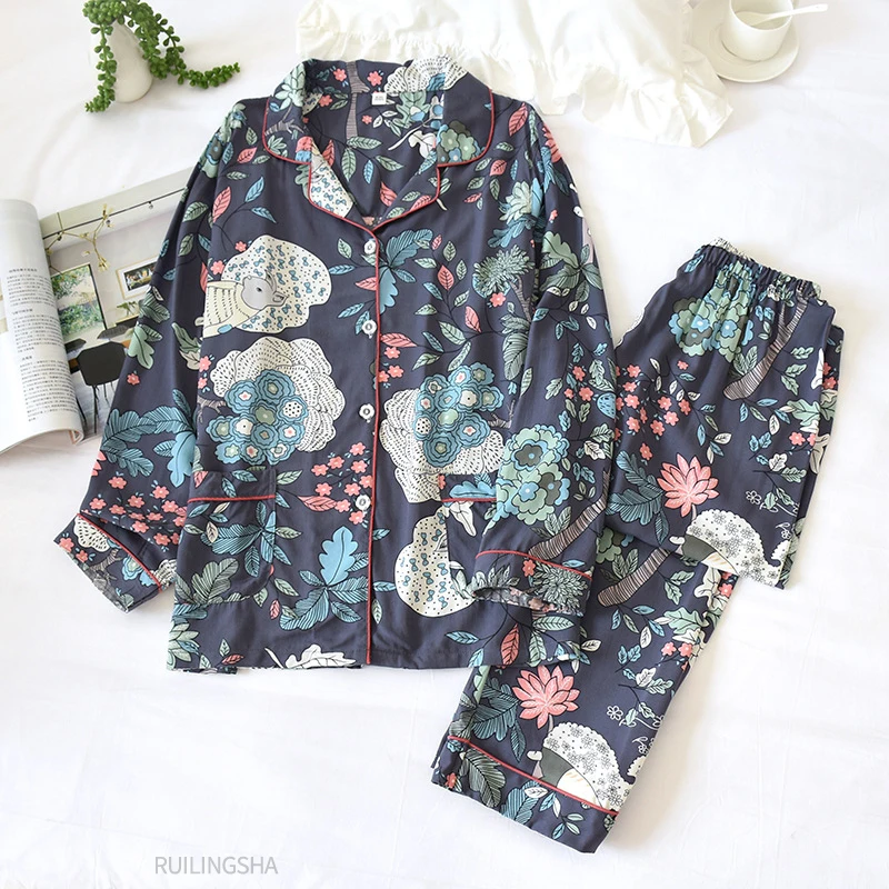 Осень 2020, женские хлопковые Пижамные комплекты с принтом, брюки с длинным рукавом и цветочным принтом, костюм, простые пижамы, ночные рубашки, рубашки для сна